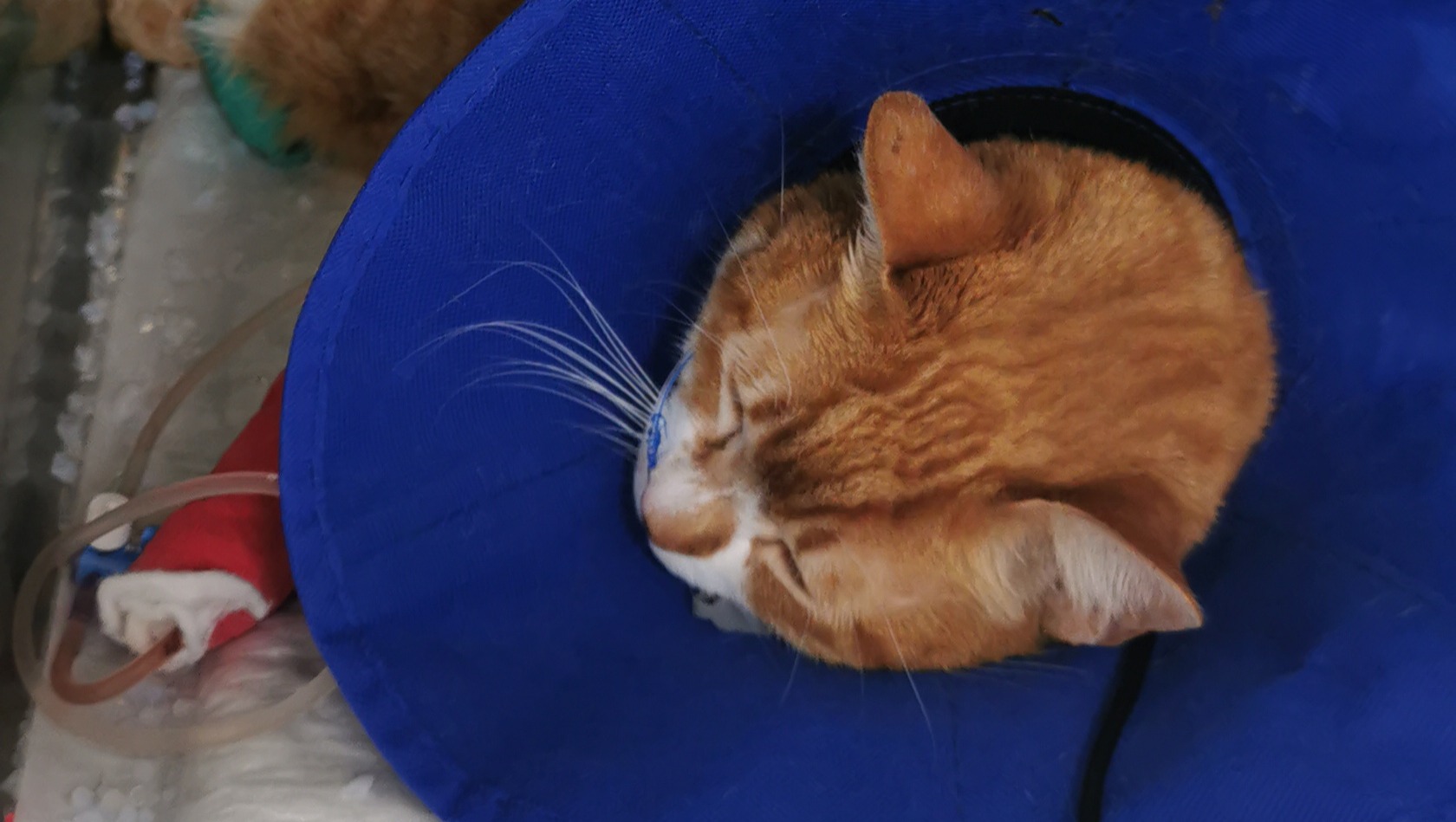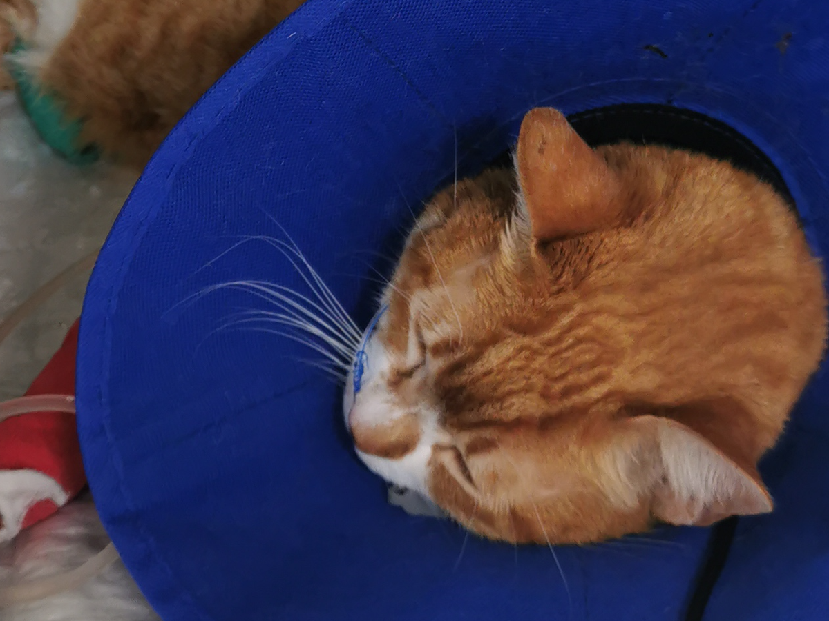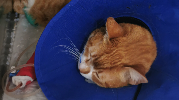 Mientras, le están dando antibiótico ahora que saben un poco mejor lo que tiene, y sigue comiendo por la sondita el 30% de lo que debería comer un gato normalmente (por el ayuno tan prolongado).