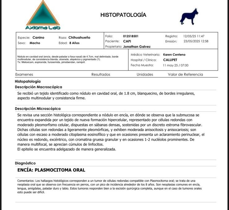 Hace poco, recibimos una noticia muy difícil: Capi tiene un tumor que necesita ser retirado con urgencia. El tumor está en una zona delicada, cerca de su paladar, y si no se actúa pronto, podría expandirse a sus vías respiratorias u otros órganos, poniendo en riesgo su vida.