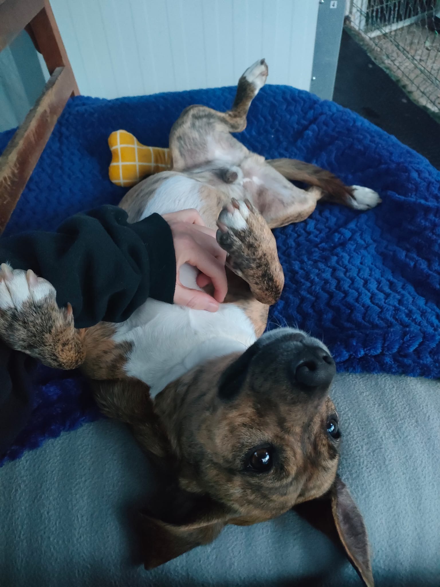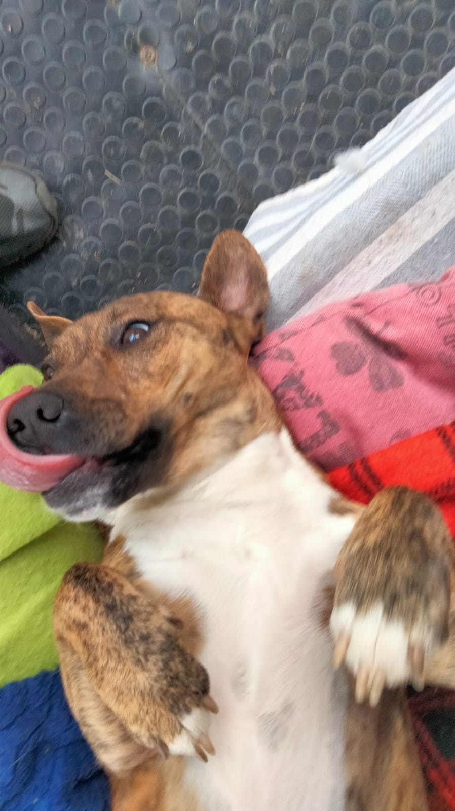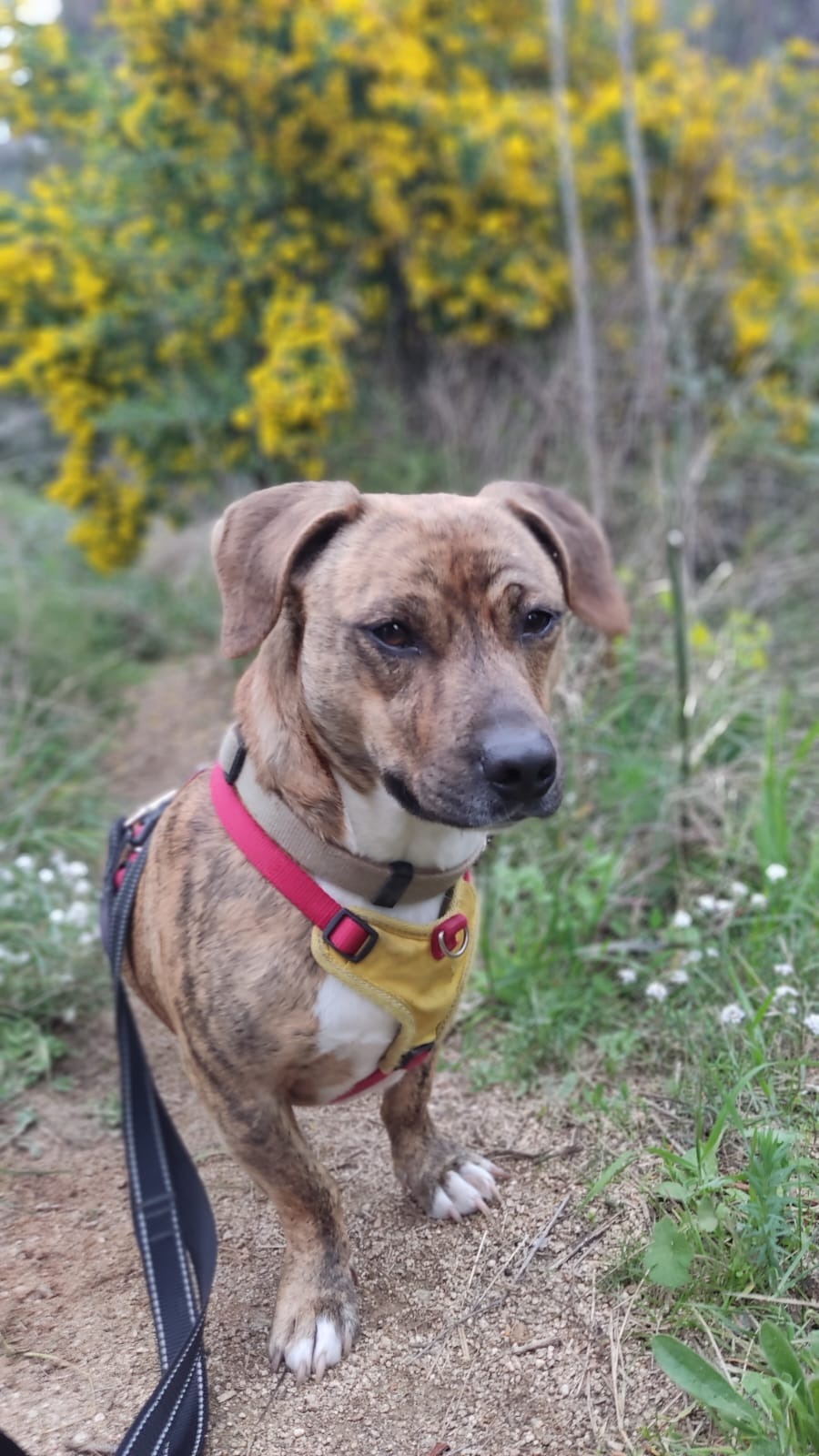Llegó siendo solo un cachorro desde una protectora en Galicia, donde ya sufría: los otros perros lo atacaban constantemente. Desde entonces, lo único que ha buscado es sentirse seguro. Y lo hace de la única manera que sabe… pegándose a las personas, pidiendo cariño sin descanso.