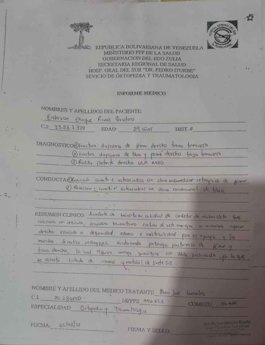 El pasado 23 de Febrero de 2025 , la vida de Enderxon Enrique Rivas Quintero cambió en un segundo. Mientras se desplazaba en su motocicleta, fue víctima de un accidente de tránsito de alta energía que le ocasionó lesiones graves en su pierna derecha. Enderxon es un joven de 30 años con toda una vida por delante, pero hoy se encuentra inmovilizado y a la espera de una cirugía urgente para no perder la funcionabilidad de su extremidad. El costo de los materiales de síntesis (clavos y pernos), los insumos médicos y los gastos postoperatorios superan nuestras posibilidades económicas actuales. Por eso, acudimos a tu buen corazón. Cada granito de arena cuenta para que Enderxon pueda entrar a quirófano lo antes posible y comenzar su rehabilitación."
