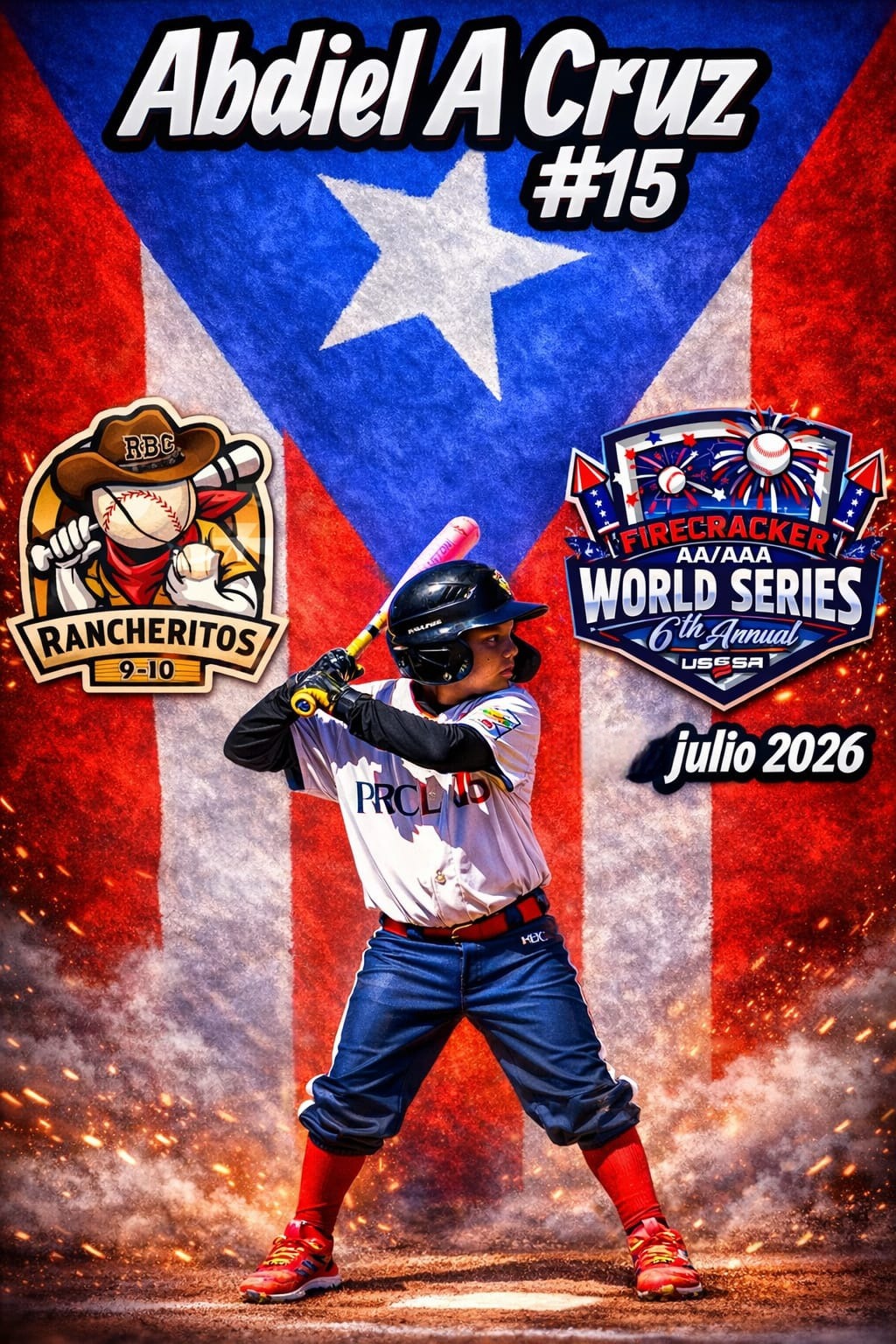 Hola, mi nombre es Abdiel A. Cruz, jugador #15 del equipo Rancheritos 10U, y con mucho orgullo queremos representar a Puerto Rico en los Firecracker AA/AAA World Series USSSA, que se celebrarán en Florida en julio de 2026. Sueño poder viajar con mi equipo a este torneo que reúne a equipos de alto nivel de diferentes partes de Estados Unidos y es una gran oportunidad para demostrar el talento, la disciplina y el corazón del béisbol.