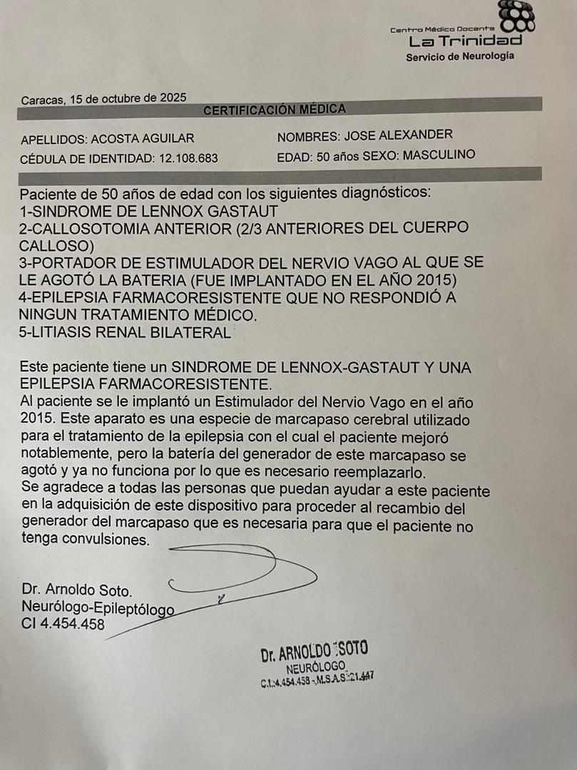 Ayuda para Alexander Acosta – Reemplazo de su marcapasos cerebral (Estimulador del Nervio Vago)