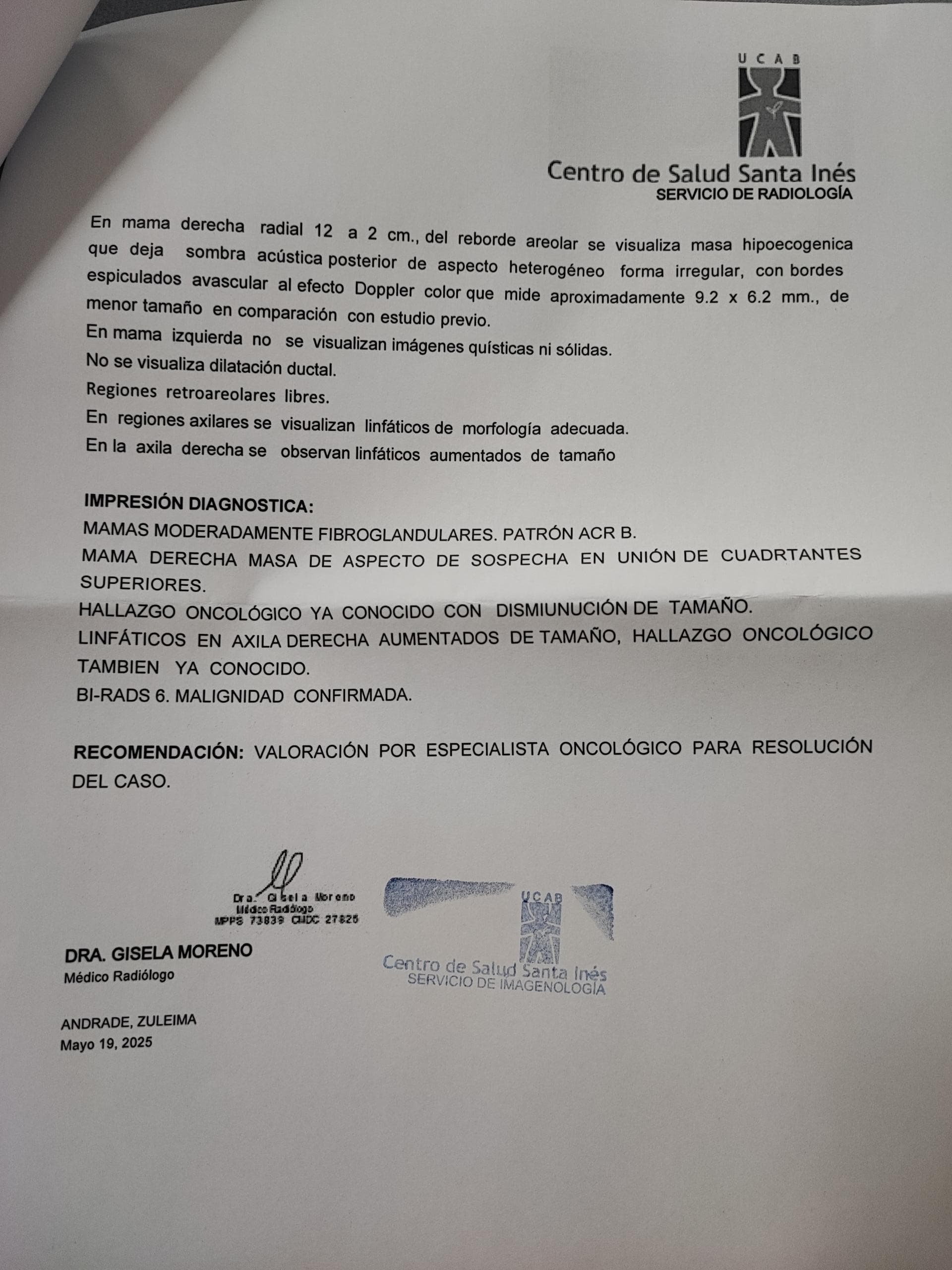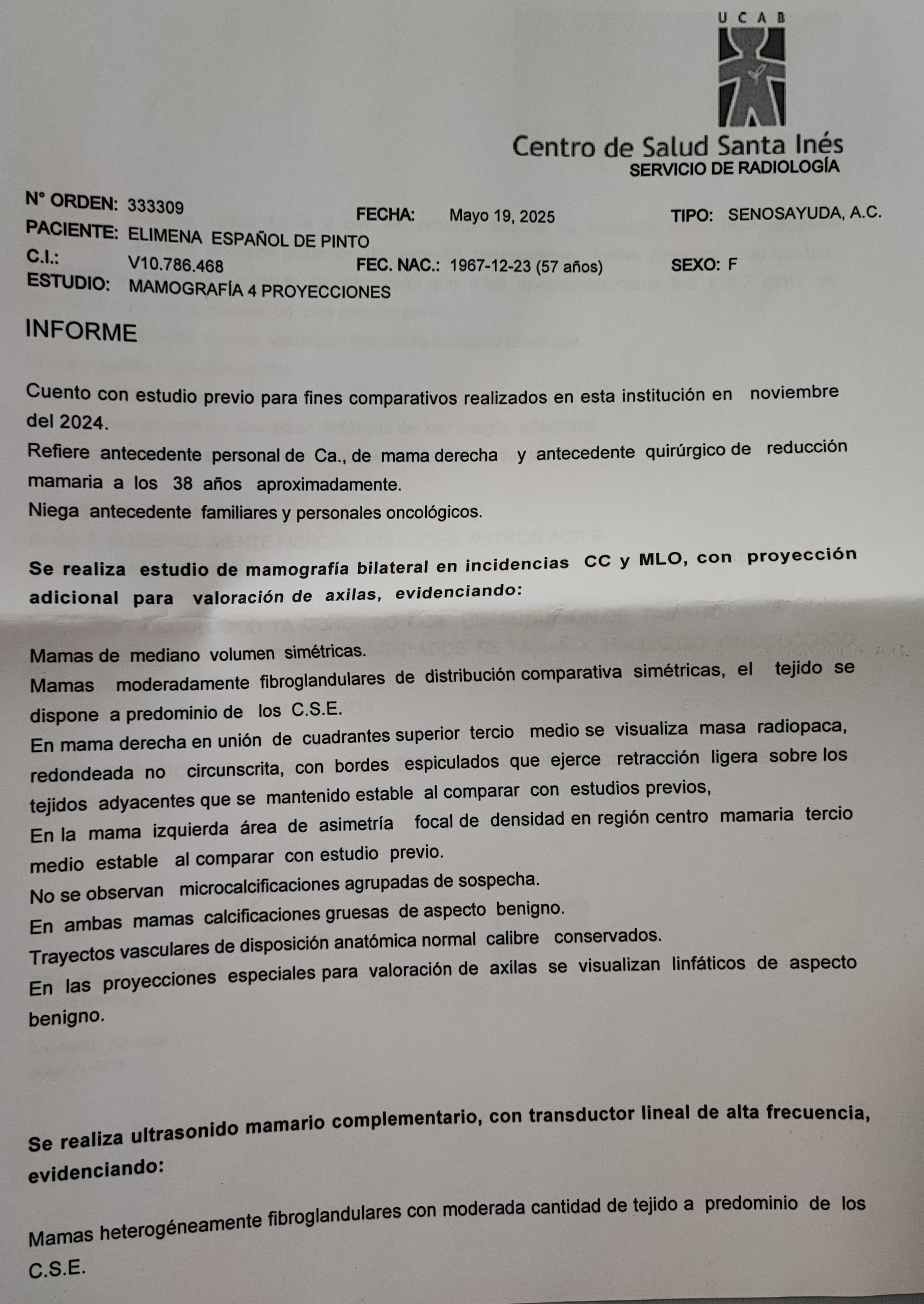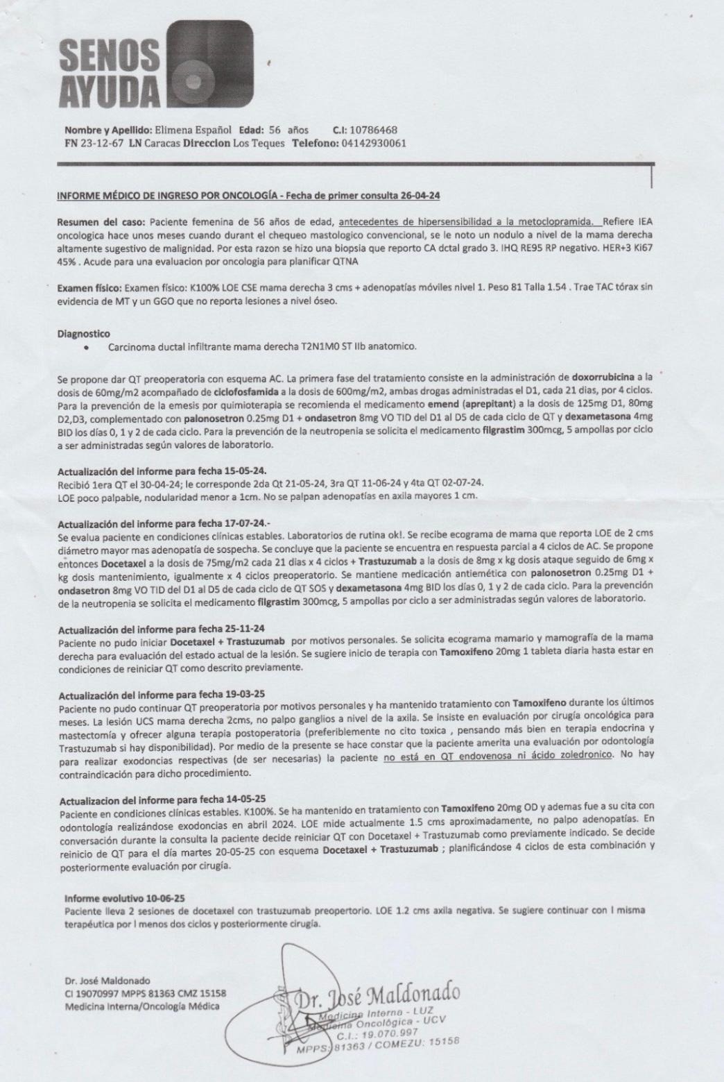 Informe médico de la Fundación Senos de Ayuda