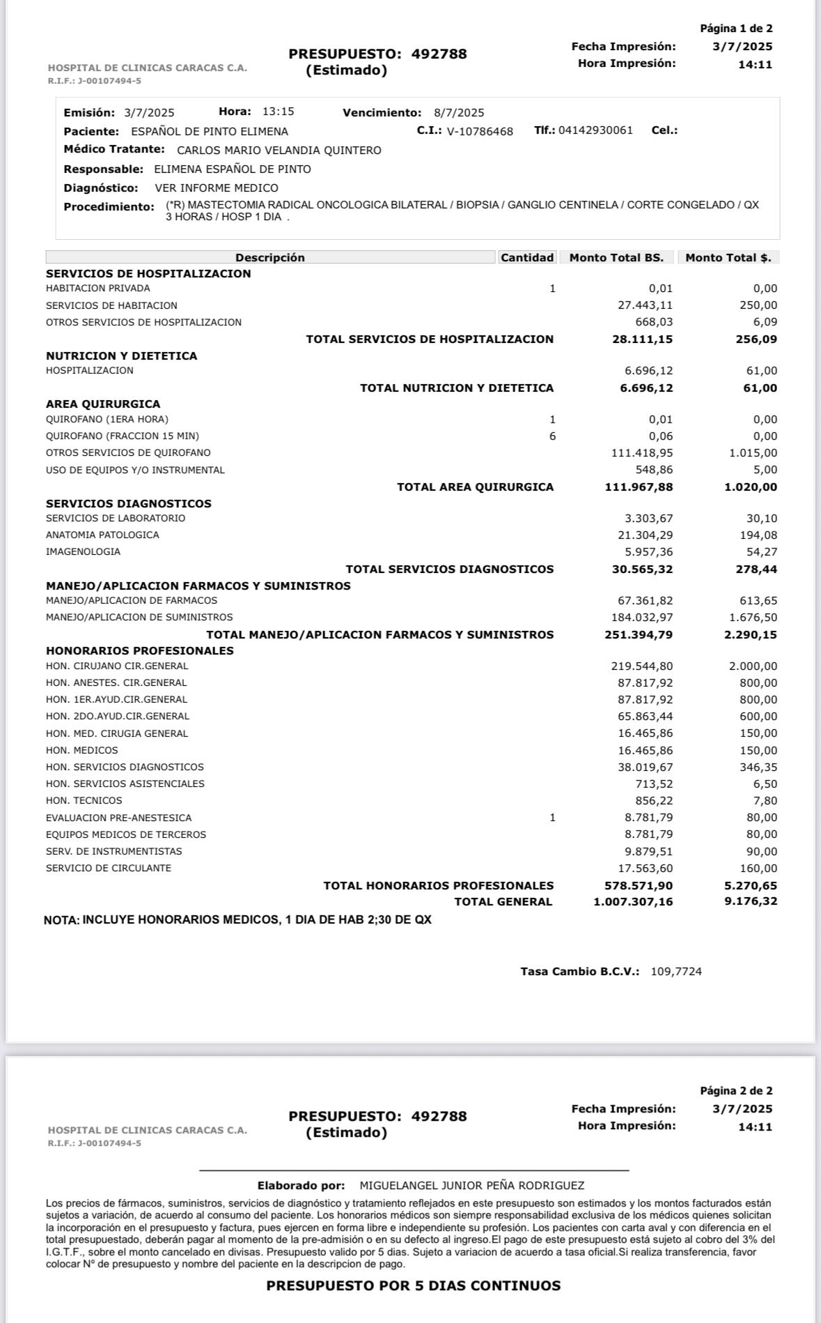 Presupuesto del Dr. Carlos Velandria
