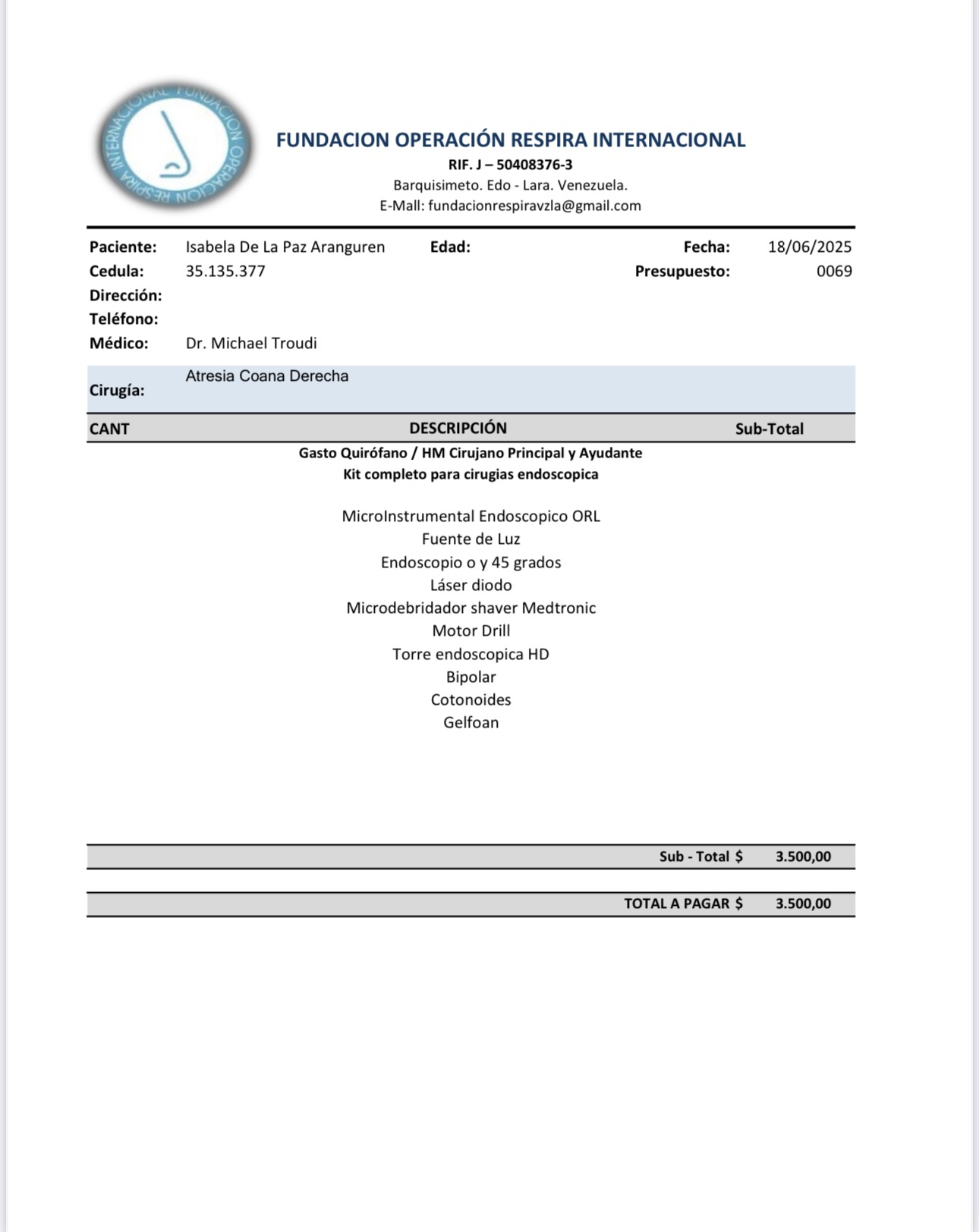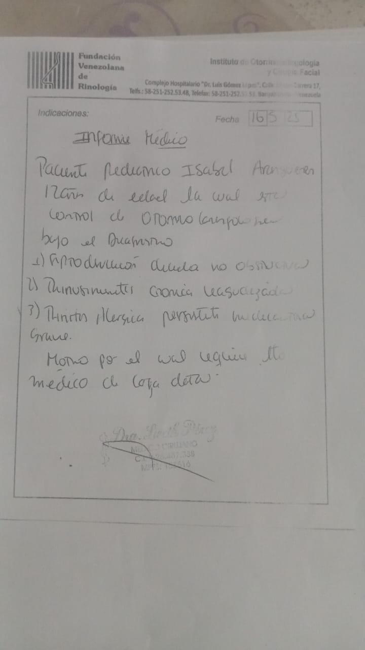 Su médico ha recomendado una cirugía endoscópica nasal, un procedimiento especializado que le permitirá abrir el paso nasal y mejorar de manera significativa su calidad de vida. Lamentablemente, los costos de esta cirugía, los estudios preoperatorios y el seguimiento médico superan los recursos que nuestra familia puede cubrir en este momento.