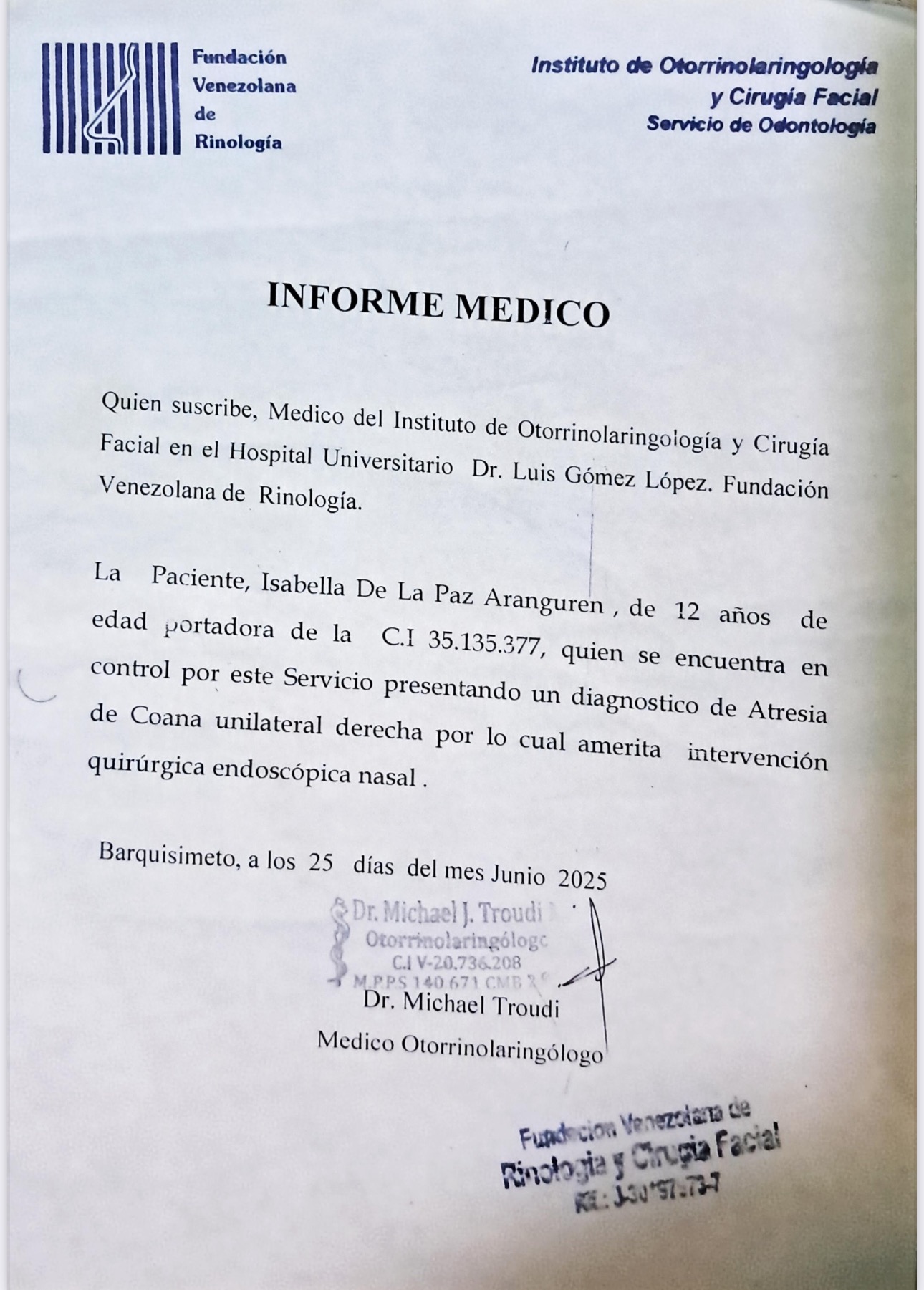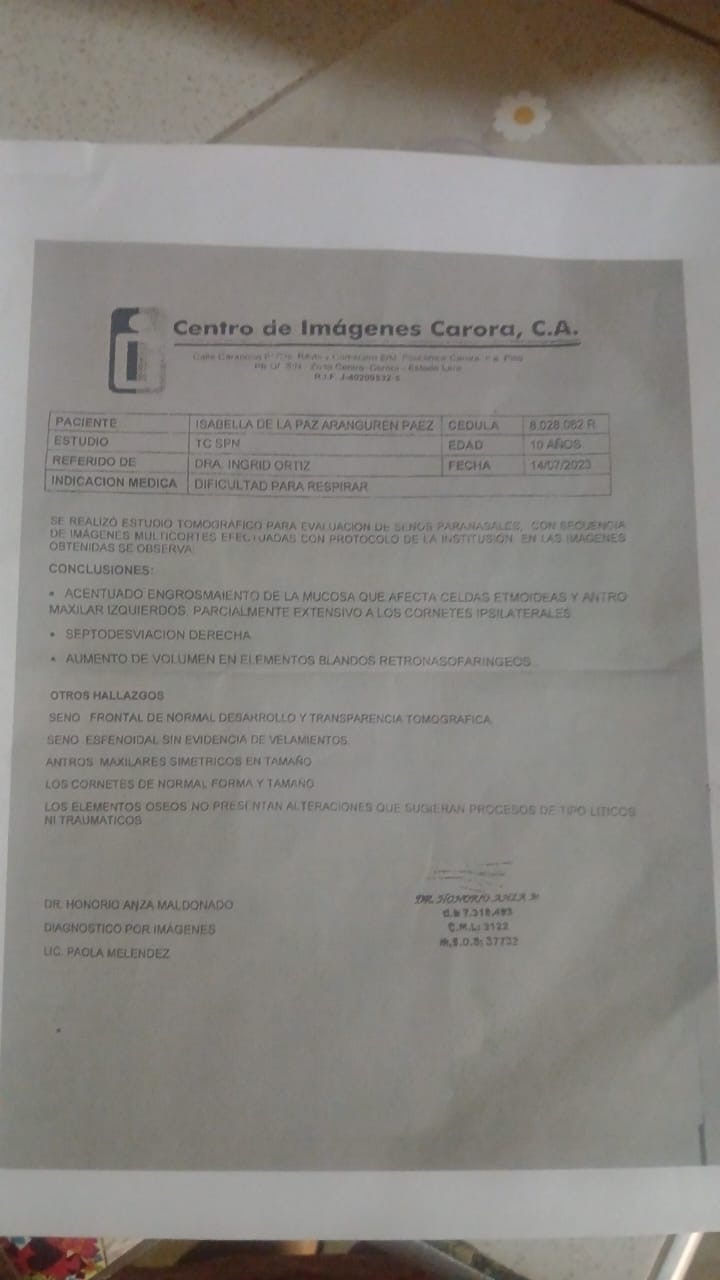 Hola, mi nombre es Lissette y les escribo con el corazón en la mano. Mi amada sobrina Isabella de La Paz, una niña de 12 años llena de luz y alegría, ha sido diagnosticada con Atresia de Coana Unilateral, una condición que le impide respirar normalmente por uno de su orificios nasales. Esto le causa muchas dificultades en su día a día: problemas para dormir bien, respirar, comer y realizar actividades que para cualquier niño deberían ser simples y felices.