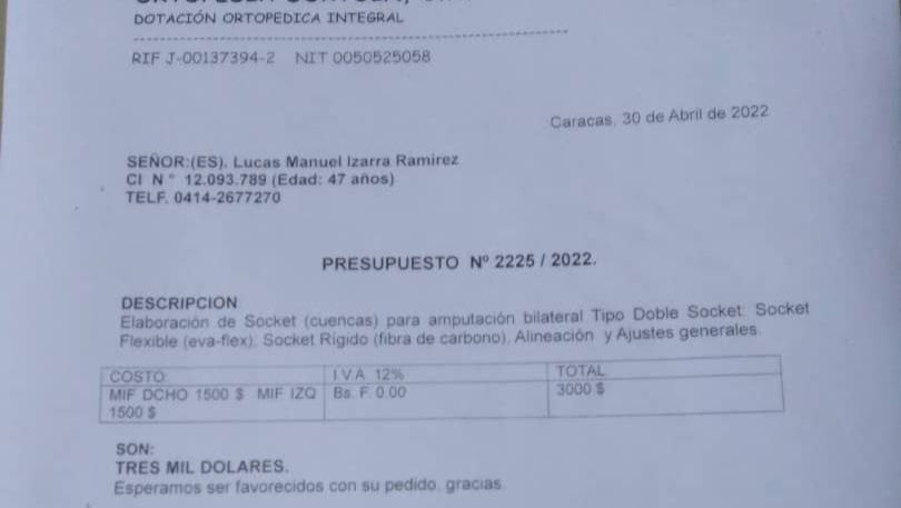 Hola, mi nombre es Lucas Izarra y vivo en Caracas, Venezuela, tengo 47 años, durante mi vida ejercí el empleo de bombero, lo cual me dio la bendición de ayudar a muchas personas. El mes de octubre de 2021 fui amputado de mis dos piernas a nivel transfemoral, debido a una gangrena húmeda que afectó mis dos miembros inferiores y obstrucción en la arteria femoral lo cual disminuyó el riego sanguineo en las mismas, estoy solicitando ayuda ya que por mi condición no tengo empleo y en mi país la situación económica no me permite costear los implementos ortopédicos que necesito para volver a ponerme en pie. Vengo hoy por este medio a pedir su humanitario apoyo, Dios mediante y gracias a tu ayuda solidaria lograre de nuevo ser útil a mi familia y a la comunidad , logrando colocar unas prótesis y de esa manera tratar de rehacer mi vida porqué tengo una familia que depende de mí , cualquier granito de arena suma ... Muchas gracias y bendiciones a todos, Dios les de mucha abundancia, vida y salud.