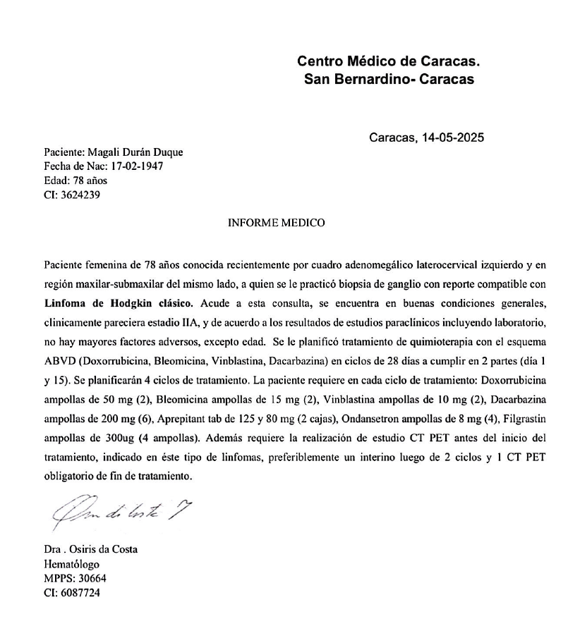 Magali Durán tiene 78 años y ha dedicado su vida con amor a su familia y a la enseñanza como maestra en Venezuela. Hoy enfrenta una difícil batalla: ha sido diagnosticada con linfoma de Hodgkin que afecta su sistema linfático, una enfermedad que requiere tratamiento médico urgente, especializado y costoso.
