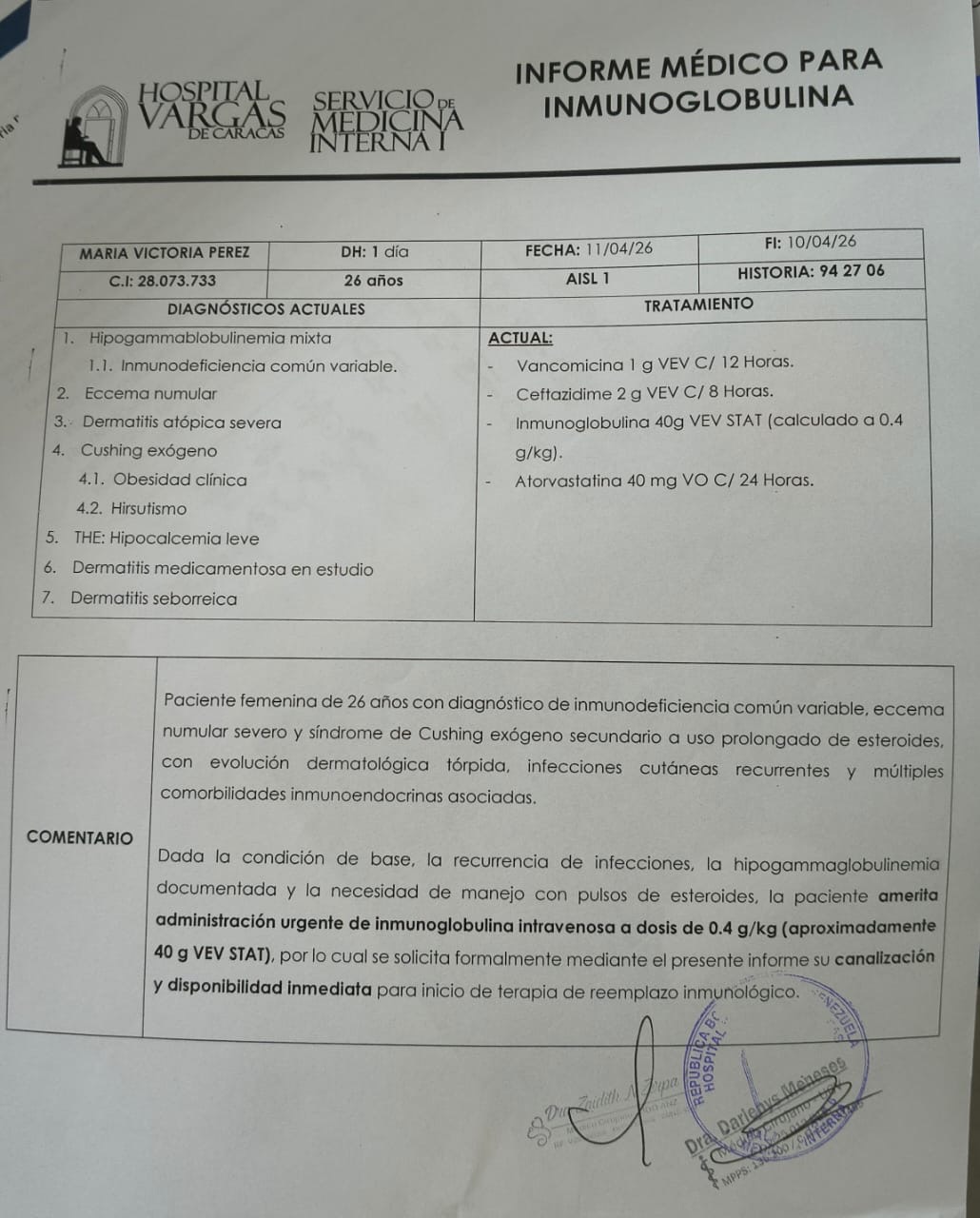 Sus médicos indicaron inmunoglobulina humana intravenosa al 5% como parte clave del tratamiento. Cada dosis cuesta alrededor de 500 USD en Venezuela y necesita entre 24 y 36 dosis.