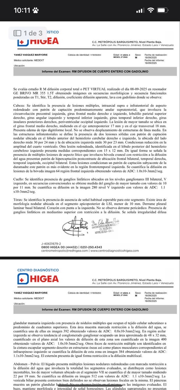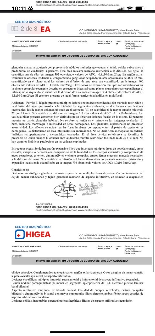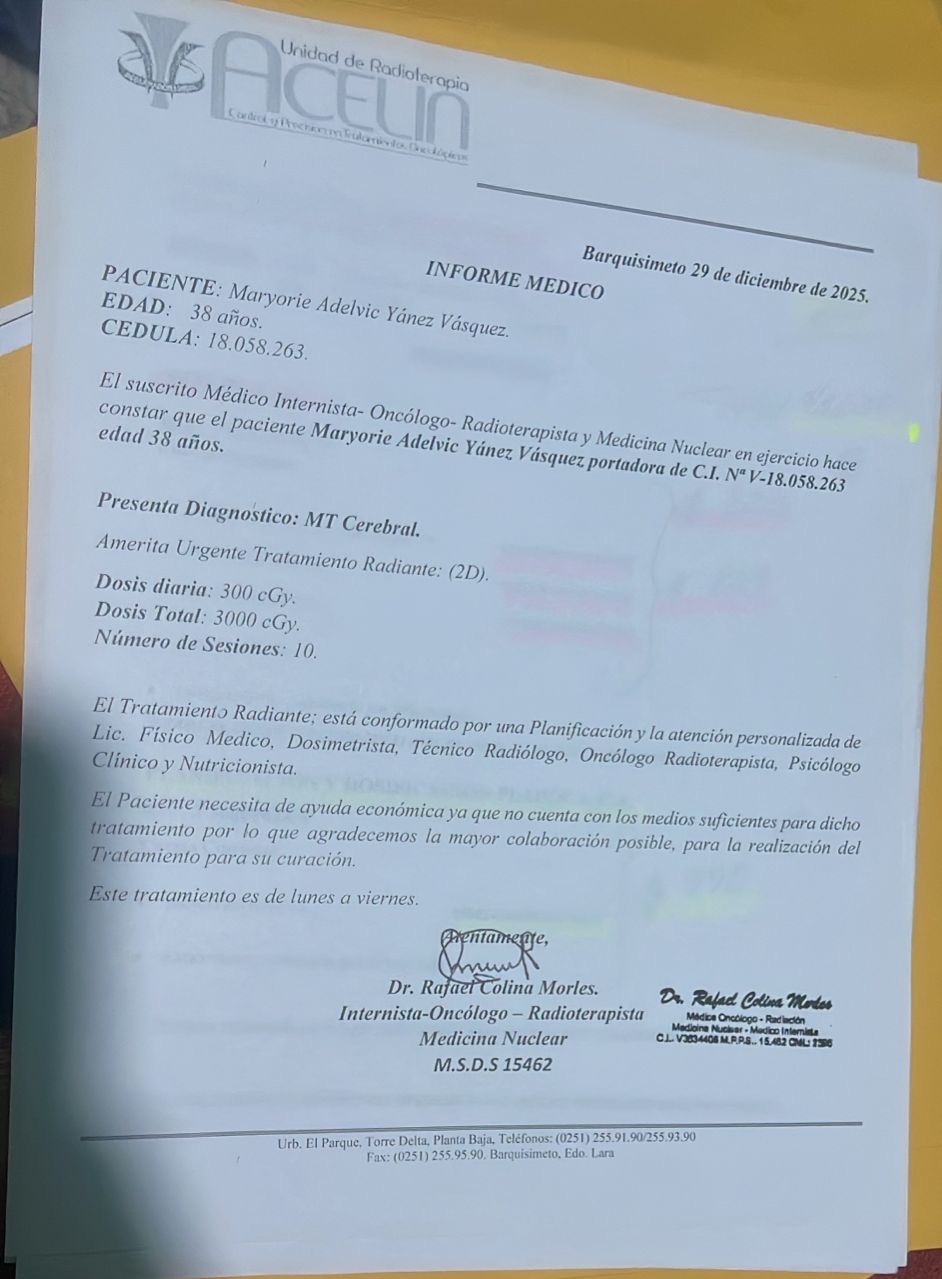 Hola mi nombre es Maryori Yanez , madre soltera y sustento de mi hogar , tengo dos hijos Jireth de 15 años y Enmanuel de 6 años . Actualmente me encuentro en cama debido a que he sigo diagnosticada con cancer de mamá con metástasis en el cerebro , pulmón, riñones e hígado . Necesito de suma urgencia realizarme 20 radioterapias , 10 en mi cerebro y 10 en mi columna para poder evitar mis convulsiones y volver a levantarme. Mis hijos y madre me necesitan , mi familia es de escasos recursos y no tenemos cómo cubrir los gastos para realizarme mis estudios . Les agradecería su ayuda , Dios se los multiplicara .