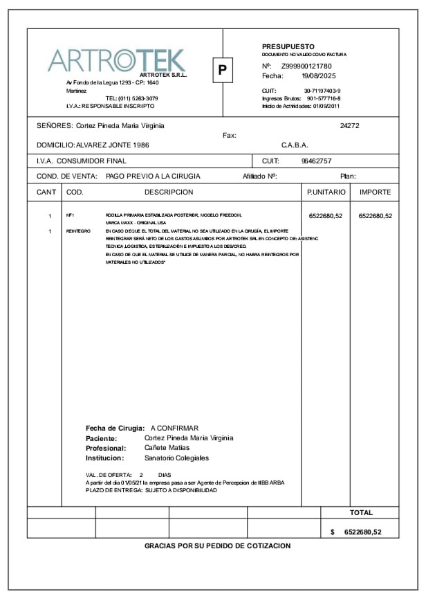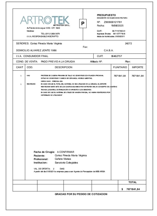 Me fui de Venezuela a Argentina porque me dijeron que acá podrían ayudarme y aunque pueden operarme, no me pueden dar las prótesis adecuadas para mí condición de salud y edad. Las que me recomiendan son las de mejor calidad, durabilidad y por ende las más costosas!!. (Bioimpianti italiana ip magnam o Artrotek maxx americana. Para reemplazo total de rodillas y caderas)