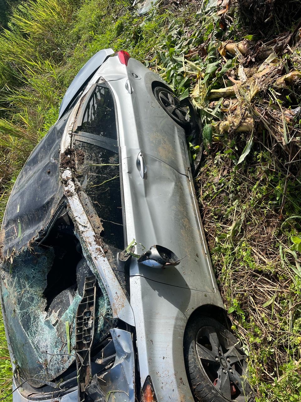 Hace unos días, Maykol sufrió un accidente en carretera durante una fuerte tormenta. Venía de dejar a unos clientes cuando una llanta trasera se pinchó, lo que hizo que perdiera el control del vehículo. El carro giró varias veces hasta caer en una cuneta profunda y quedó completamente volcado.