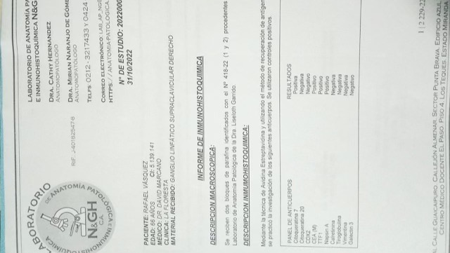 From there, a chest tomography was performed and fungi, bacteria and tuberculosis were ruled out. To conclude, a biopsy performed on a lymph node in his neck revealed that he had stage III metastatic lung cancer. The doctors warned that he has to start treatment as soon as possible, otherwise the discomfort and difficulties in breathing and moving around will worsen.
