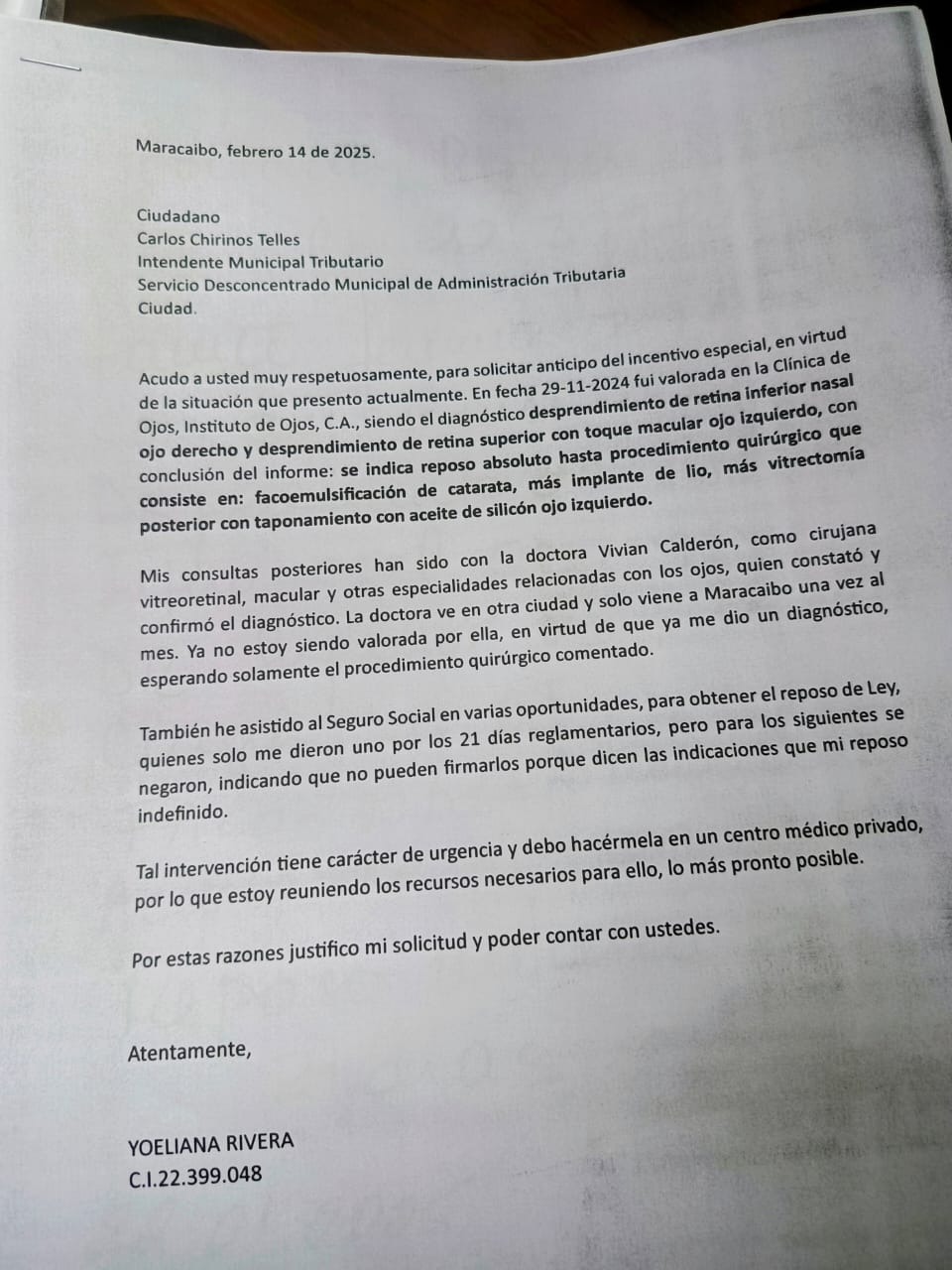 Me dirijo a ustedes con la esperanza de encontrar apoyo en una situación difícil que estoy atravesando. Desde noviembre del 2024, fui diagnosticada con un desprendimiento de retina en ambos ojos, una condición que requiere atención médica inmediata y tratamiento especializado.