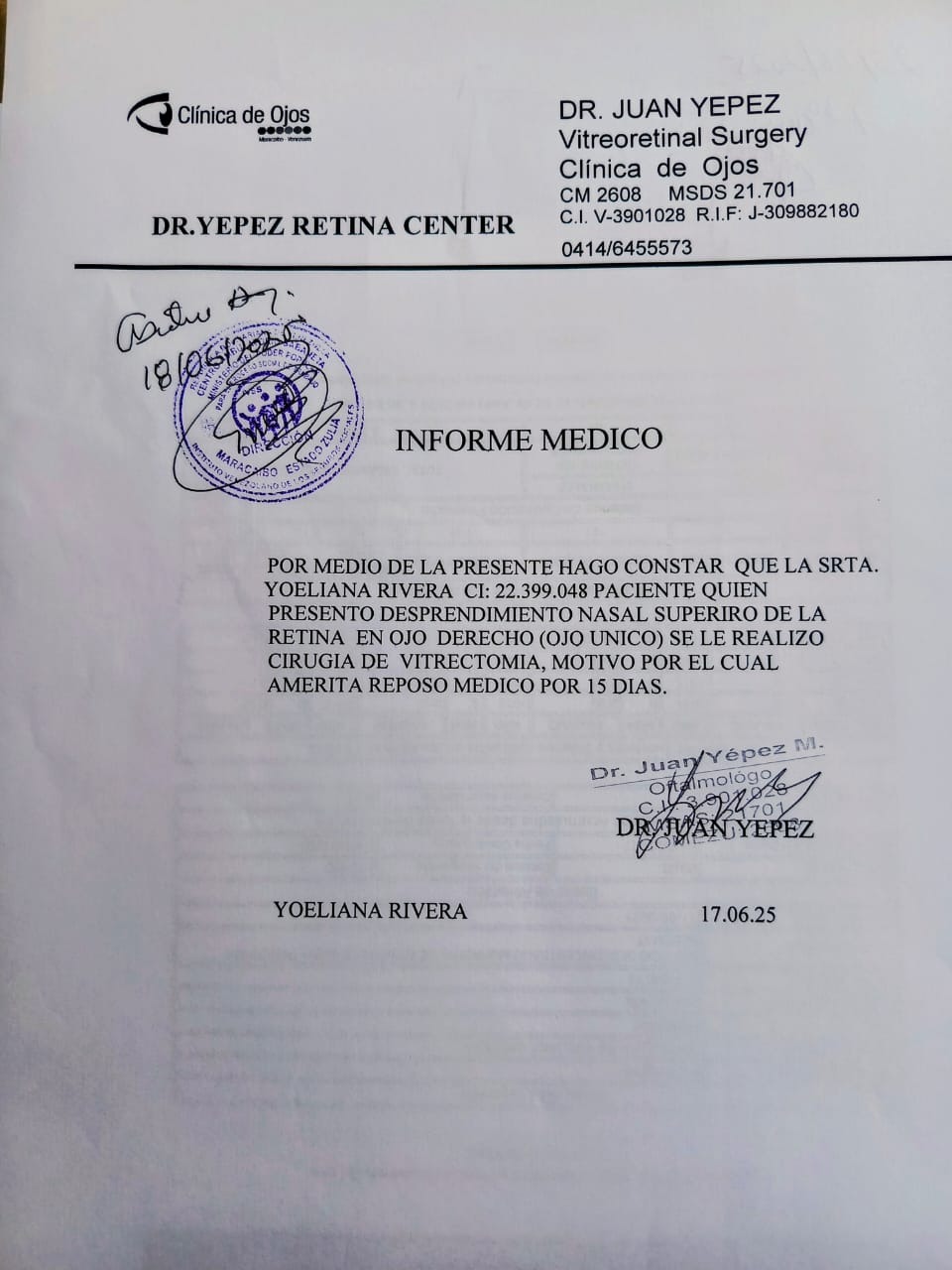 En fecha 29-11-2024 fui valorada en la Clínica de ojos, Instituto de Ojos, C.A., siendo el diagnóstico desprendimiento de retina inferior nasal de ojo derecho y desprendimiento de retina superior con toque macular ojo izquierdo, Con Conclusión del informe: se indica reposo absoluto hasta procedimiento quirúrgico que consiste en: facoemulsificación de catarata, más implante de lio, más vitrectomia posterior con taponamiento con aceite de silicón ojo izquierdo.