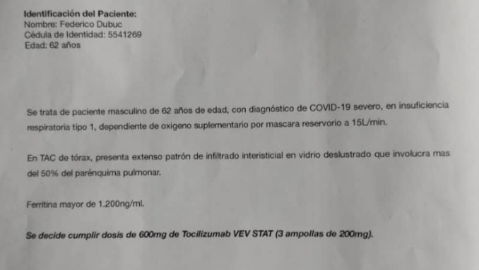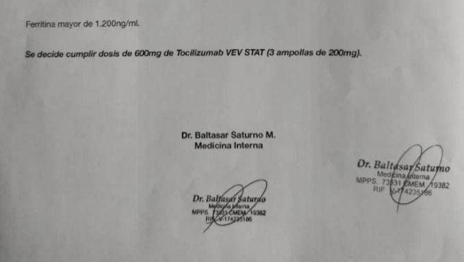 Hace tan sólo 14 días comenzó a sentir malestar estomacal, rechazando comida y agua. Esta situación fue empeorando hasta que el 18 de julio fue ingresado a la Clínica Urológico de San Román donde fue diagnosticado de COVID-19 severo con insuficiencia respiratoria tipo 1, con ambos pulmones comprometidos. 50% de sus paredes pulmonares se encuentran afectadas. Se encuentra actualmente bajo el cuidado del Dr. Baltasar Saturno donde está recibiendo un tratamiento a base de ampollas de Tocilisumab, 600 mg la dosis.