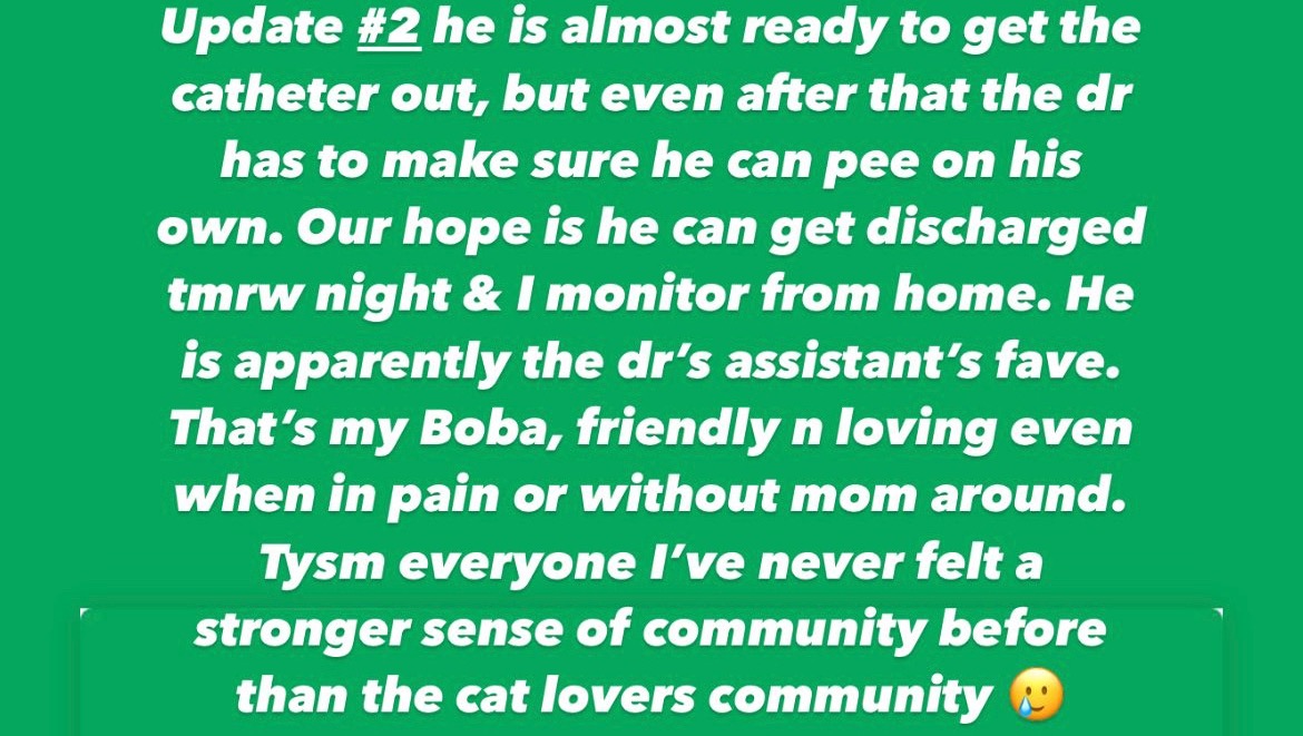 Hi all, Rose here…most of y’know my cat #2 Boba as my baby boy. He means the world to me but he was rushed to the vet due to bleeding and not eating! I have never asked for handouts before, I really don’t like to… sigh but I was dumb not to get pet insurance and he fell into a costly emergency — which seemed to be UTI at first but now has escalated to stones blocking his pee pee hole. He needs to be monitored overnight while he has a catheter in and this is only months after my dad fought kidney stones which is pretty similar as a human condition. The estimated Vet + ER bill is over 5K but I’m seeking some help from friends and family ext. that can give anything to lessen my burden as I’m already in so much debt. Thanks in advance & I appreciate you reading this! Boba will thank you too.