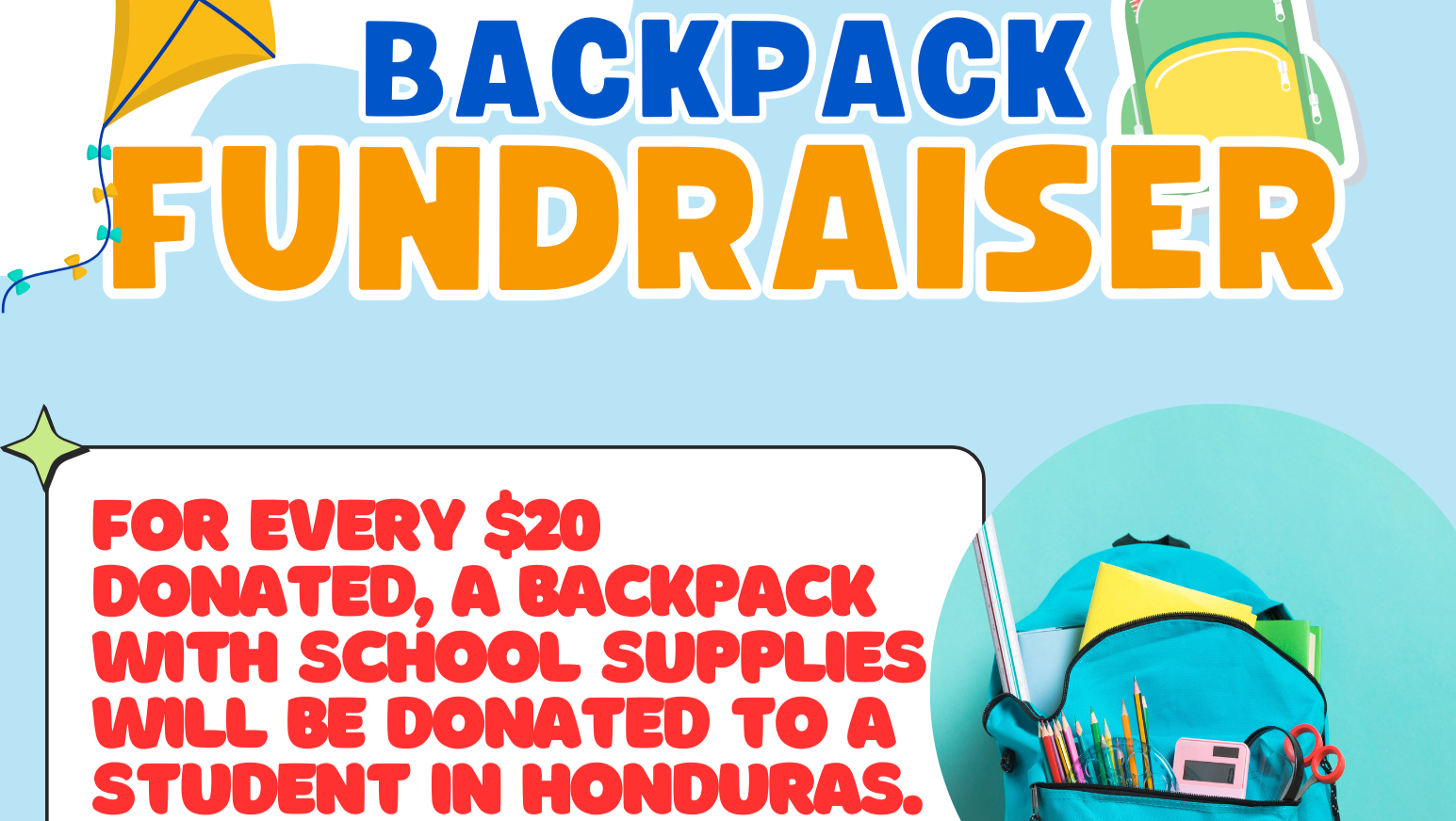 Ayudanos a donar una mochila con utilies escolares para niños y niñas que los necesitan en Honduras.