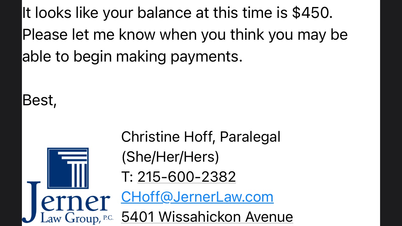 Unfortunately, I am reaching out again—I have a balance with my lawyer that despite my best efforts, I cannot come up with.