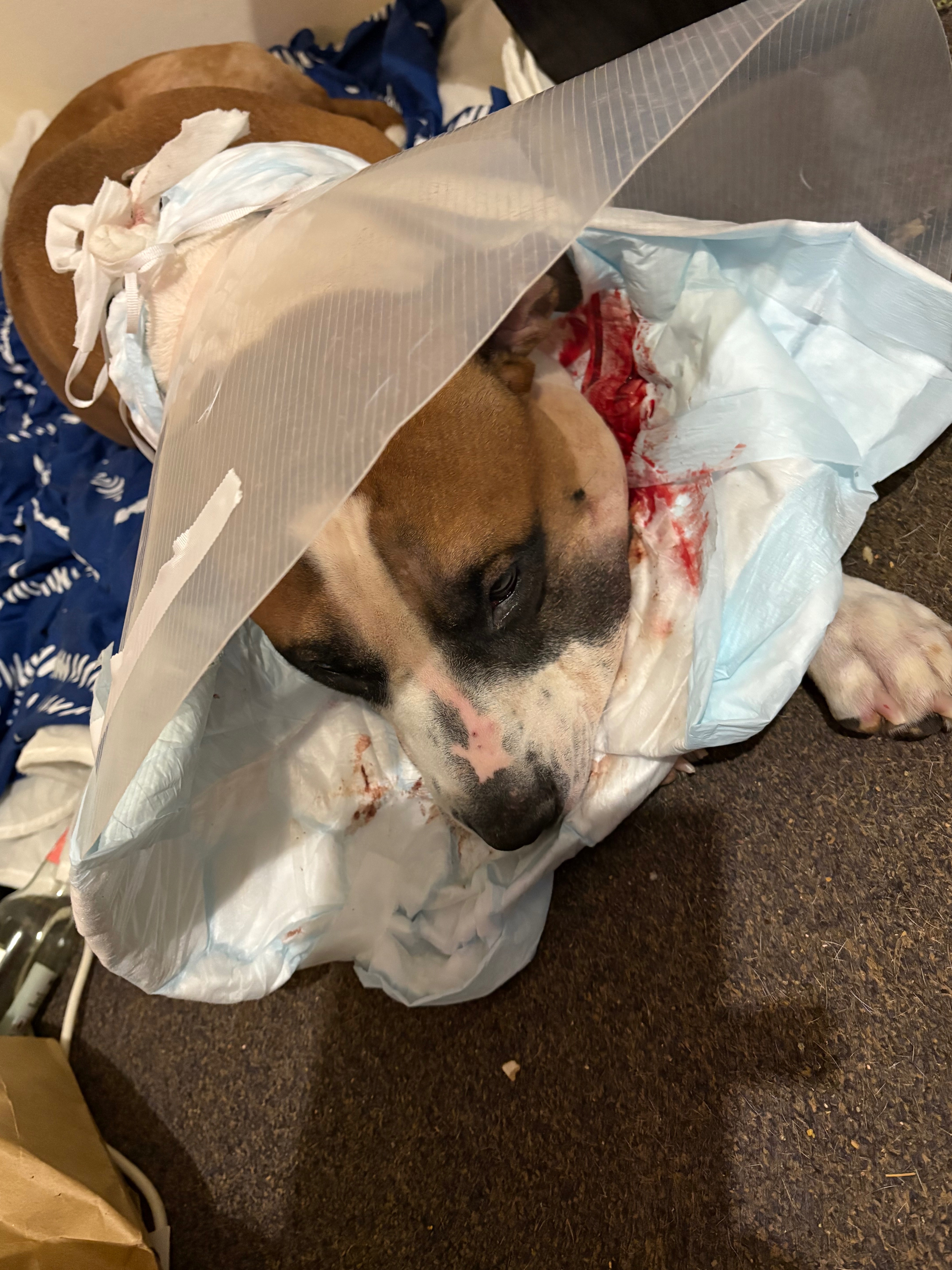 To ensure there wasn’t any foreign object(s) left behind from previous injuries, Bandit had exploratory surgery today to see what was going on. X-rays did not show any foreign object, but they could not rule it out completely. The abscess has been drained and Bandit is now home but requires considerable care and pain management, plus a two week course of antibiotics. Fingers crossed, they got everything.