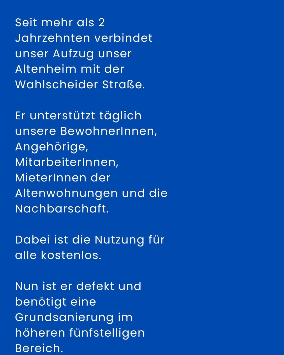 Pfarrer Reinhard Bartha i.R., Aufsichtsratsvorsitzender des Ev. Altenheim Wahlscheid e.V., wünschte sich 2001 zu seinem 50. Geburtstag über einen öffentlichen Aufruf einen Fahrstuhlturm für die Bewohnerinnen und Bewohner unseres Altenheims, für die Mieterinnen und Mieter der Altenwohnungen sowie auch für Menschen, die privat im Umfeld oberhalb der Wahlscheider Straße wohnen.