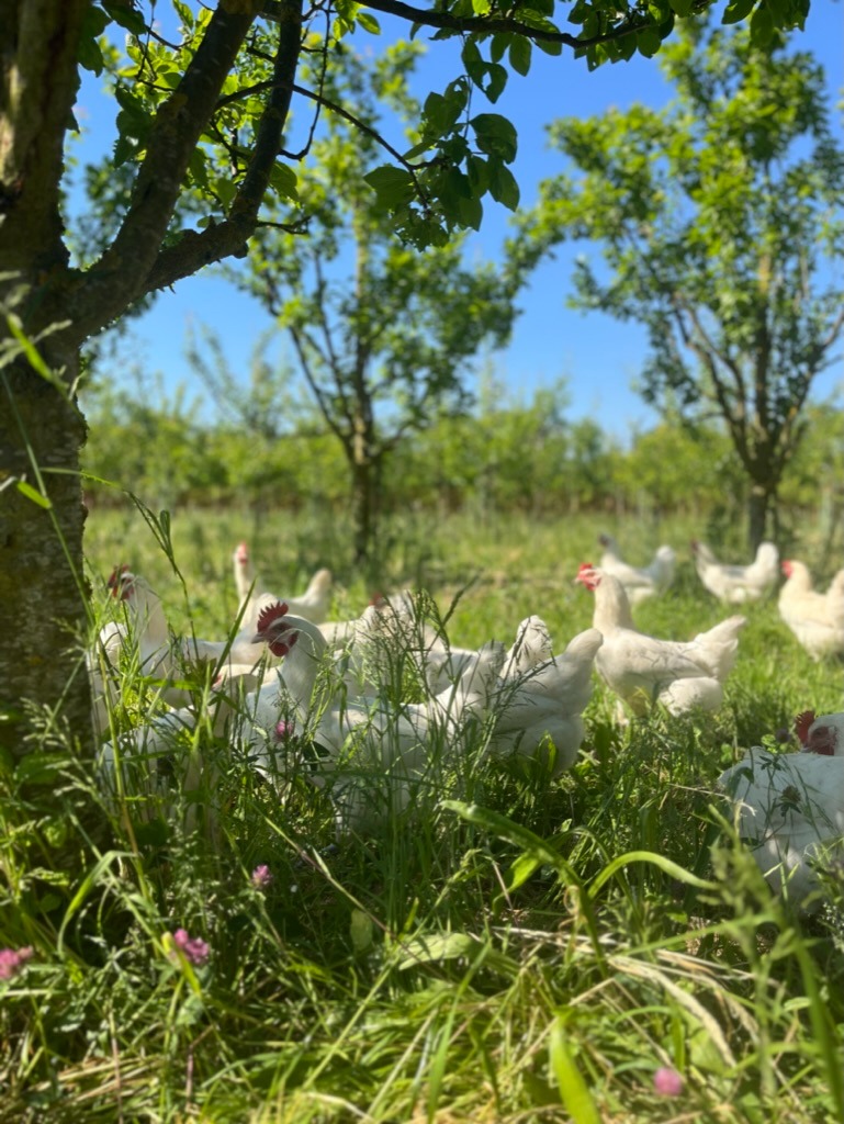 Auf 1 ha Wiese entsteht unser Hühnerwald mit Esskastanien, Walnüssen, Obstbäumen und vielen Sträuchern. Die Hühner bekommen Schutz und Schatten, gleichzeitig entstehen Lebensräume für Vögel, Insekten und andere Tiere, und das Mikroklima wird stabiler.