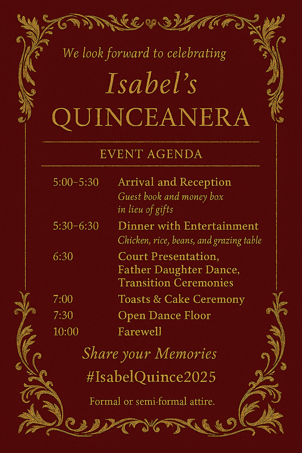 Whether it’s the music, the food, the decorations, or the attire, every detail reflects the love and support surrounding Isabel as she steps into this new chapter. We are deeply grateful for each of you — whether you’re able to attend in person or simply wish to be part of the celebration from afar.