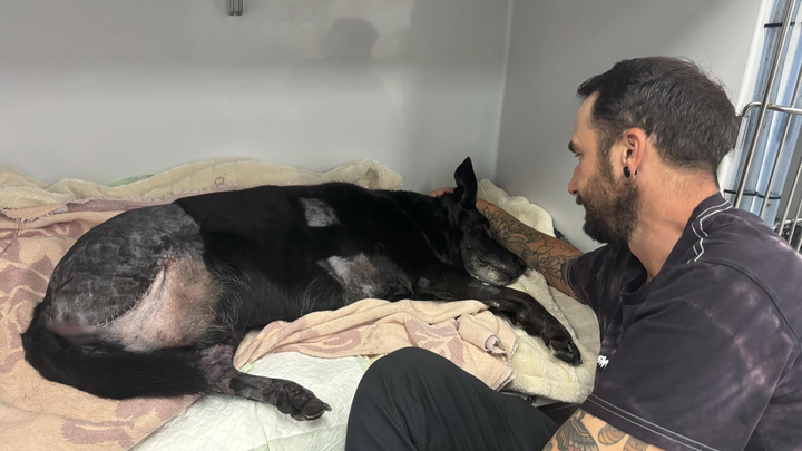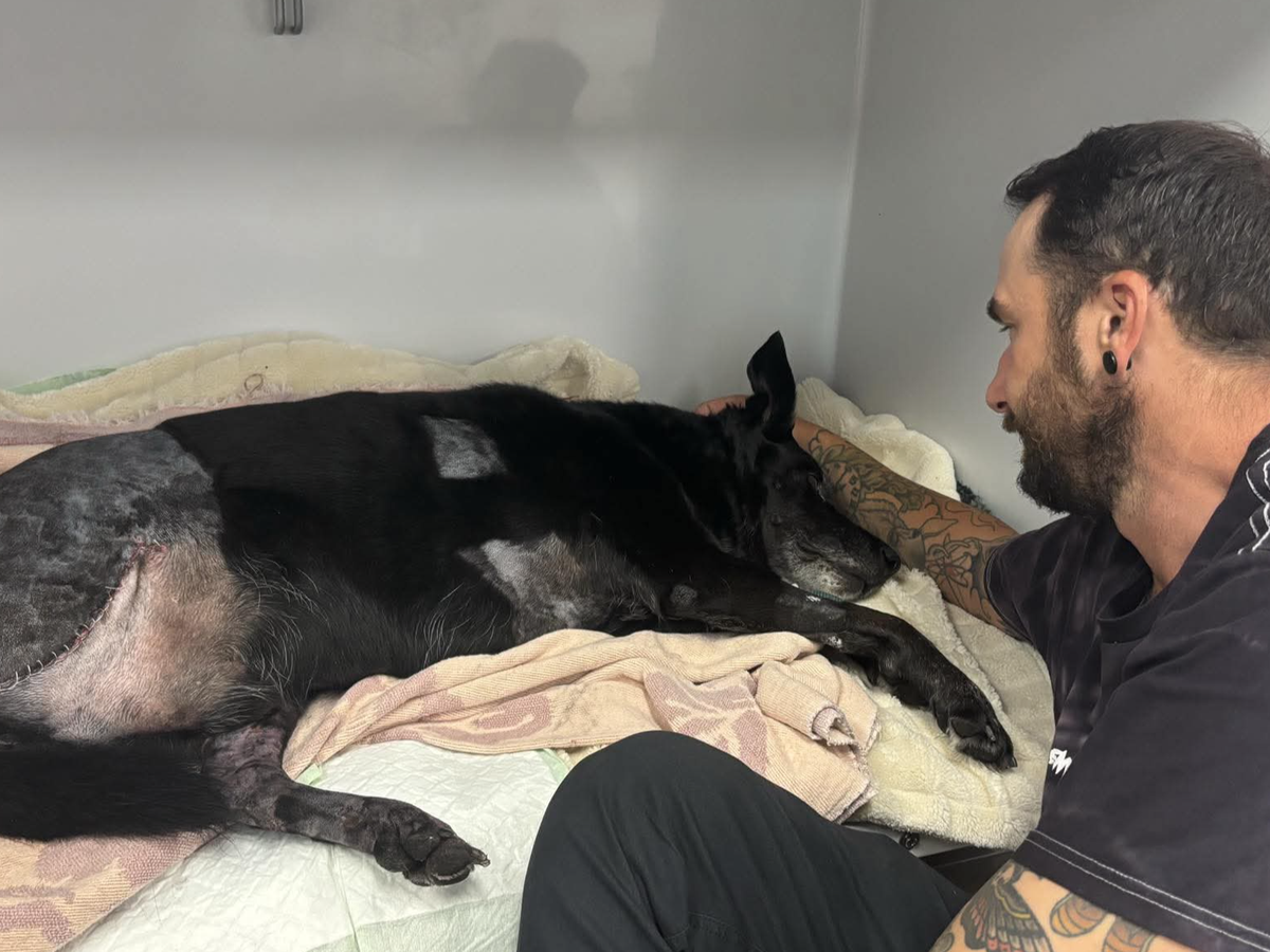 Hi my name is Gaye, I'm writing to share that my son Tim and his wife Cat's dog, Bear, was hit by a car on Monday morning. He survived, but his injuries are serious, and he has undergone surgery to amputate his back leg.