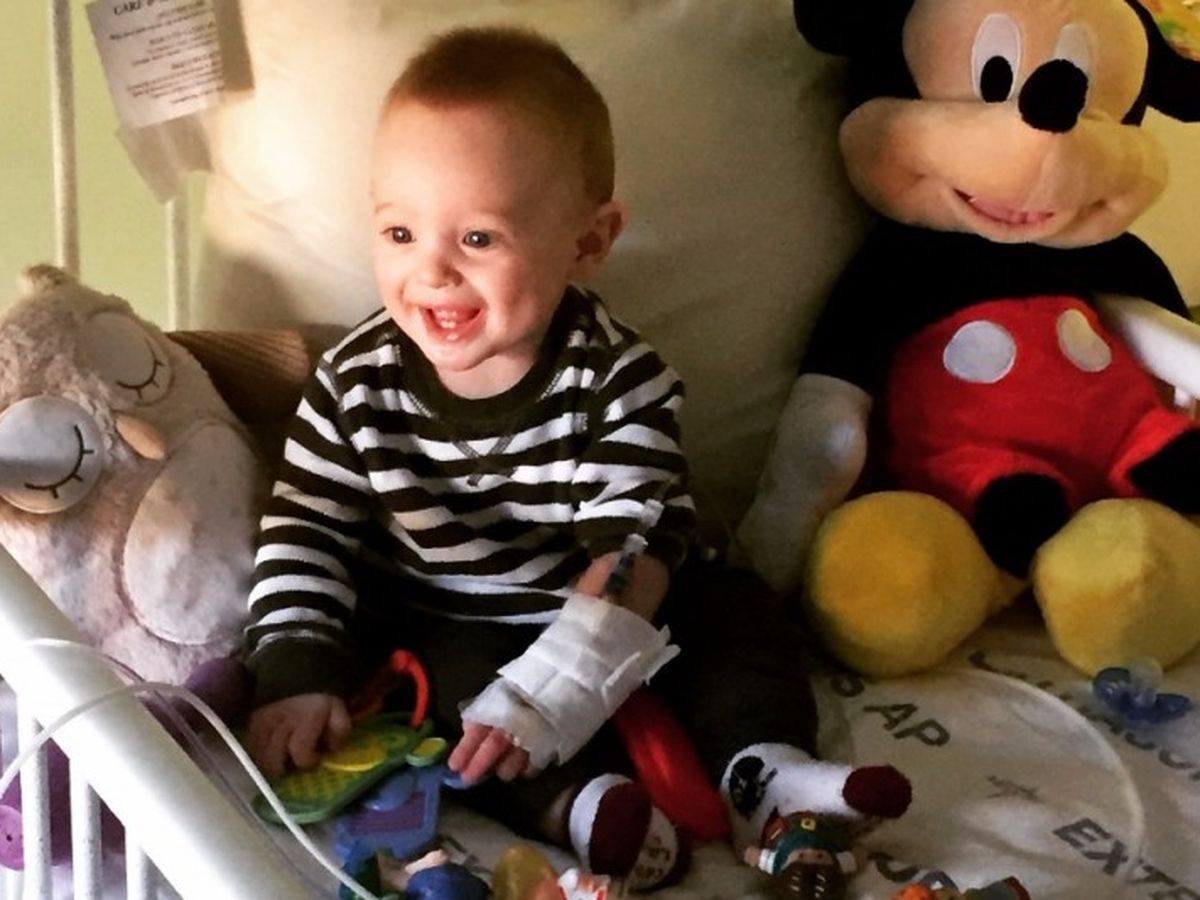 Initially he gained weight so they were discharged and sent home but within 24 hours he was vomiting again and had a fever of 103, so back to the hospital they went. The answers they have received so far, is that Beau has contracted RSV, which is a very serious respiratory virus that takes months for healthy children to overcome. With sutures still in his belly, coughing has really taken a toll on Beau and they will continue to stay in the hospital until doctors are comfortable with sending him home. There is still a chance that the G Button is yet again in the wrong place, therefore Beau could have to endure yet another surgery in order for him to intake enough to gain weight and grow as normal.