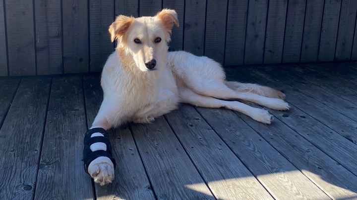 Und so hieß es für Bella: so viel wie möglich schonen und das Vorderbein nicht belasten! In ihrem Fall ist das eine echte Herausforderung gewesen, denn sie hat ja nur ein zu belastendes Vorderbein und kein zweites zum entlasten. Eine Mammut-Aufgabe für die Pflegestelle. 6 Wochen absolutes Minimum und so viel wie möglich schonen!