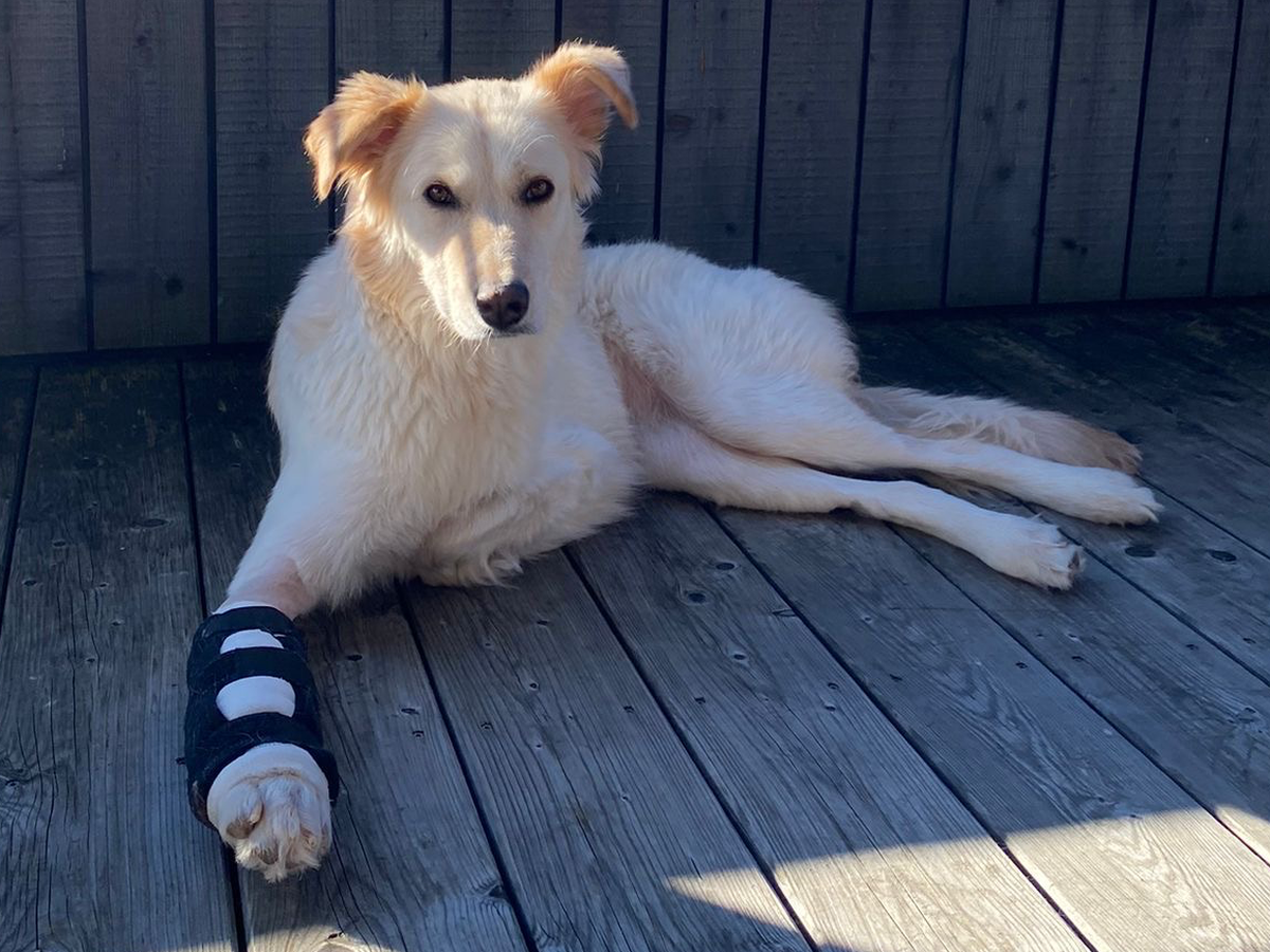 Nach weiterer Vorstellung in der Klinik in Thessaloniki musste die linke Vorderpfote erstmal nicht amputiert werden. Sie hat keine Probleme und kommt super damit zurecht, aber ohne sie zu benutzen.