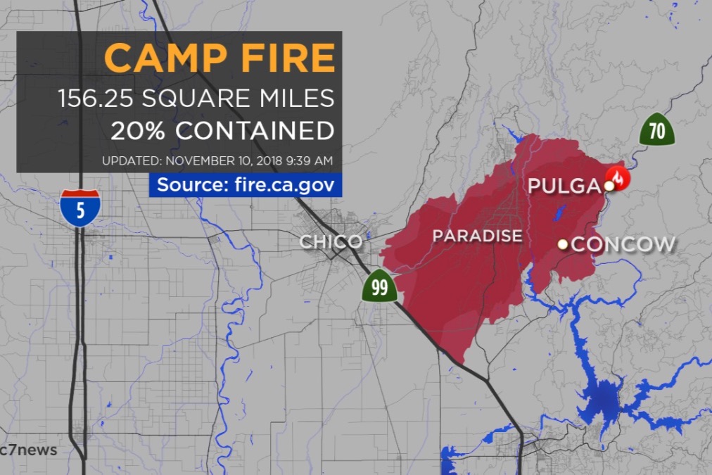 This picture shows the extent of the fire. https://abc7news.com/maps-a-look-at-the-camp-fire-in-butte-county-and-other-california-fires/4656293/