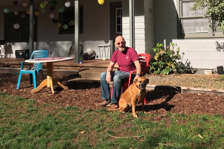 Our dad with Django outside their home.