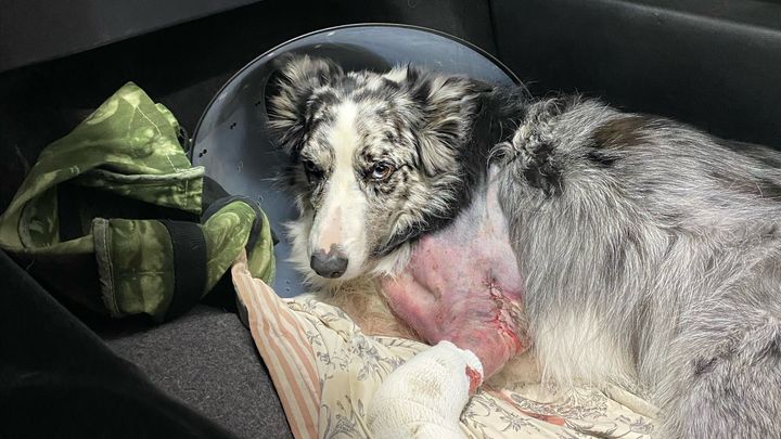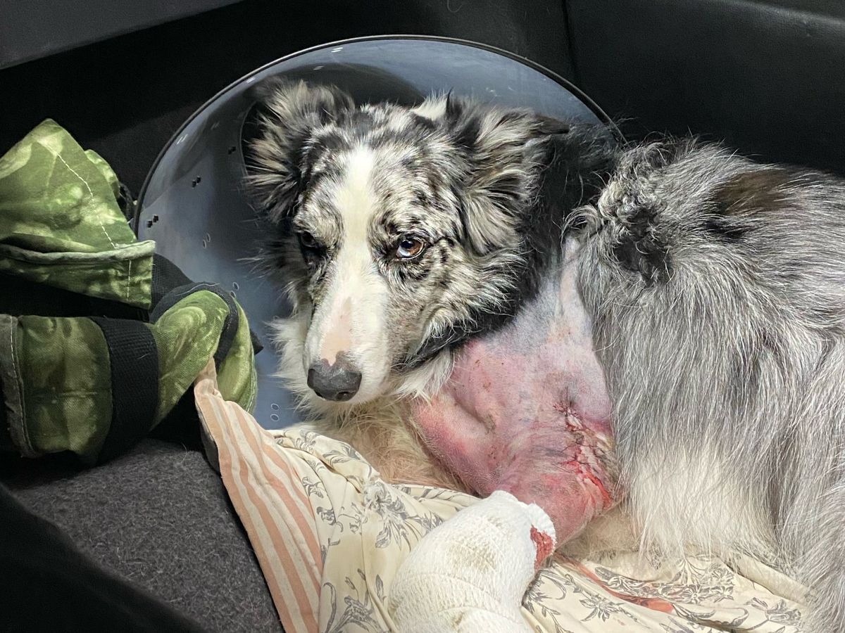 Bentley is our gorgeous 5 year old Border Collie, who was hit by a truck this past week on a very foggy and icy day while my parents were away. We rushed our sweet boy to the vet, in what looked like a very dire situation. He sustained head wounds, a broken rib, a broken elbow, air trapped in his chest wall, a torn ligament in his knee, and lost his left canine. He also has some pretty severe road rash and a few more small wounds.