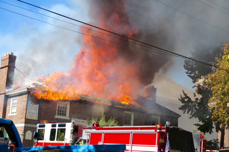 The fire spread through the attic of Pilgrim Hall to the Sanctuary roof. The firefighters were able to contain it so it did not spread beyond the southeast corner of the roof, but there is significant water (and presumably some smoke) damage to the sanctuary, especially above the chancel and first few rows of pews. We will certainly be displaced from the sanctuary for a while.