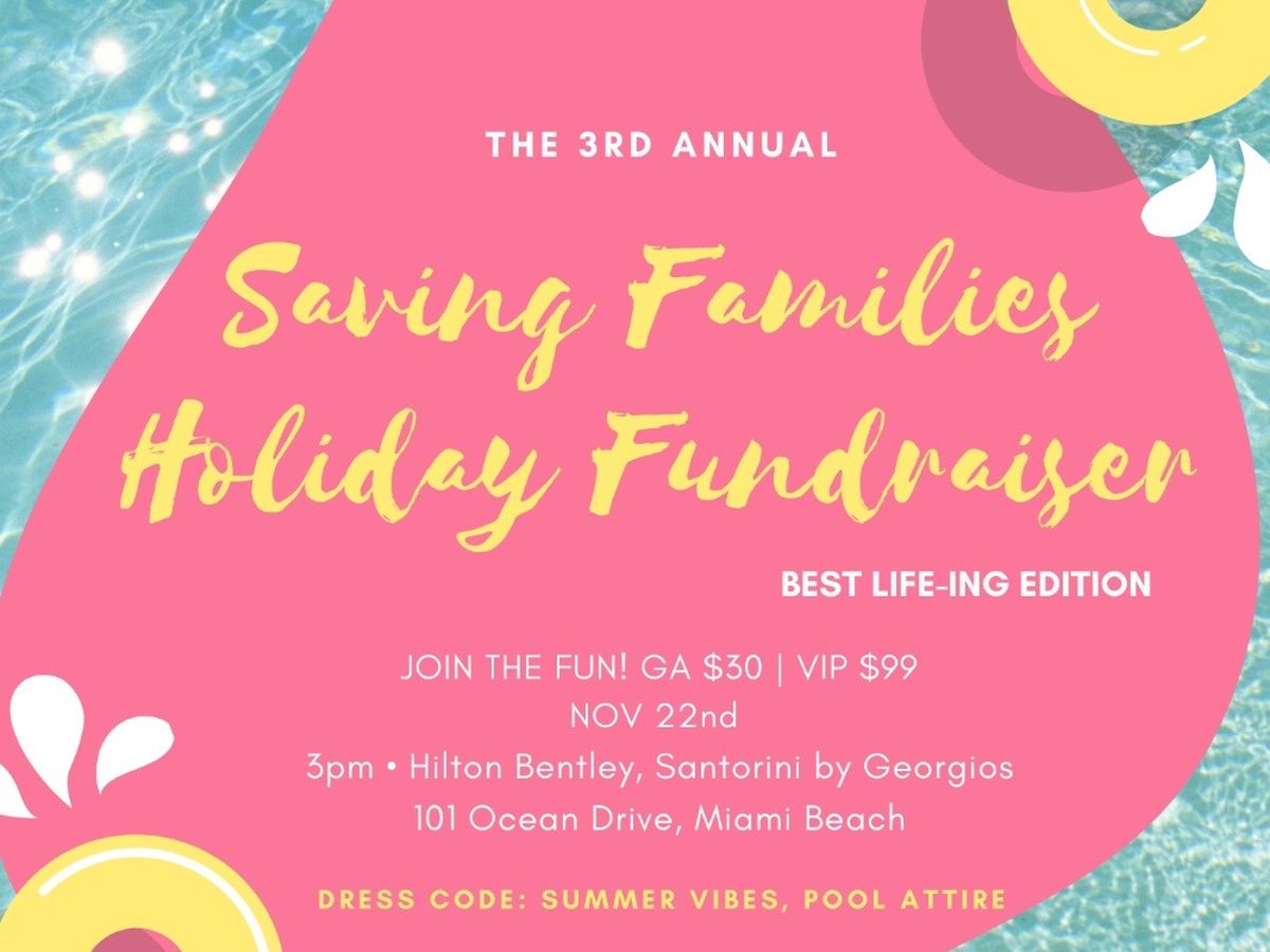 This year’s Saving Families Holiday Fundraiser will be held in Miami at Santorini by Georgios in the Hilton Bentley Hotel on November 22nd, at 3 pm. Don your casual beach attire for fun, food and drinks by the pool, and tons of raffles and giveaways. Browse our wellness stands, partake in a yoga primer, learn about fitness, or have a personal nutrition coaching session. Dance the afternoon away with tunes from our Best Life-ing resident DJ and enjoy other performances. Our 7 Areas of Life framework presentation and author meet and greet is sure to super-charge your motivation, and help you reach your goals to live your best life.