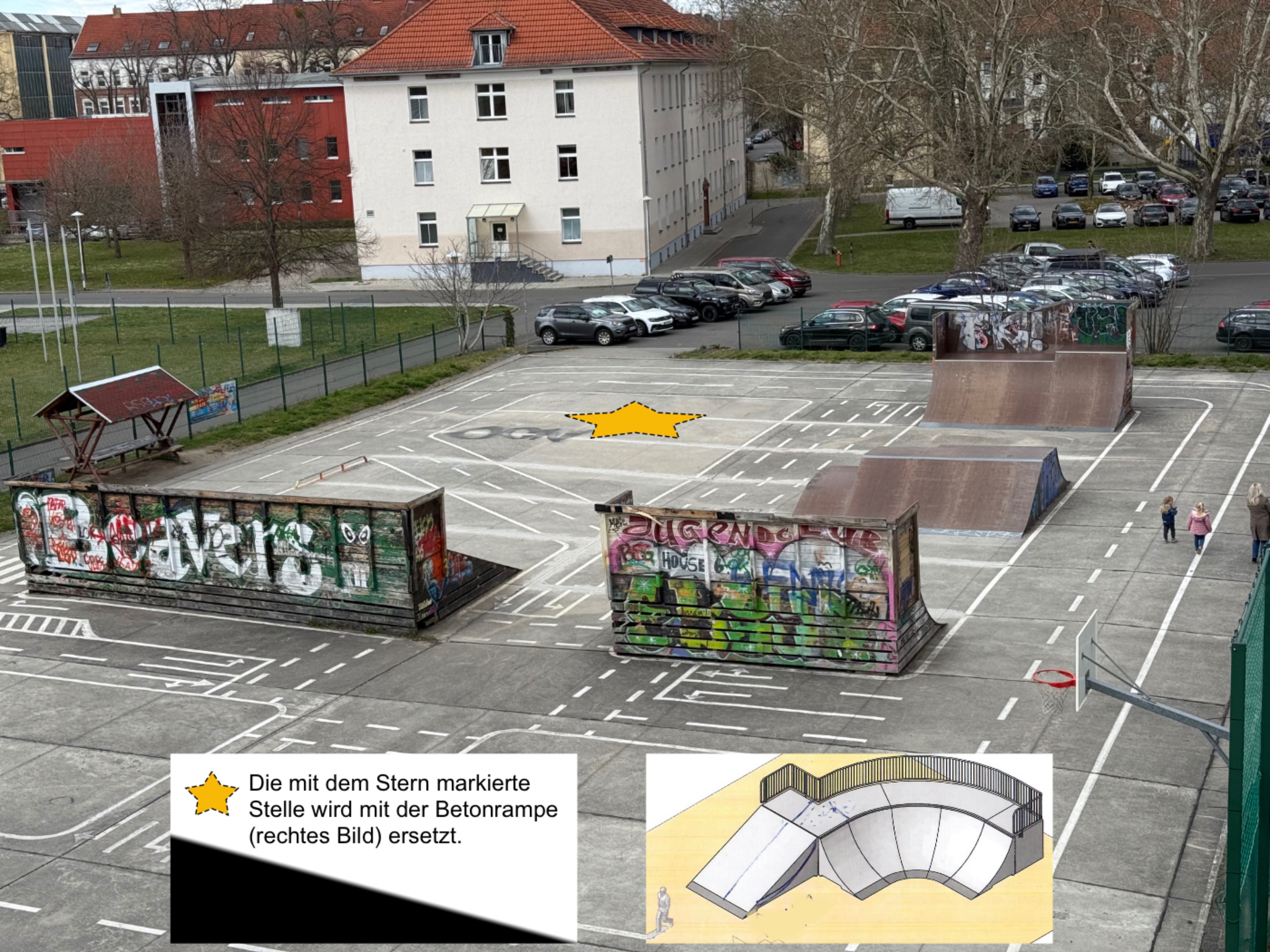 Ein Element, die Plattform-Bank mit Lody, musste 2023 abgerissen werden, da die Unterkonstruktion massive Schäden aufzeigte. Dieses Element soll im Jahr 2025 durch ein größeres Betonelement ersetzt werden. Nach der Umsetzung dieses Vorhabens können die jungen Skateboard Begeisterten endlich wieder den Skate-Park für ihre Zwecke nutzen. Die Anlage soll damit attraktiver für Anfänger gestaltet werden und soll der Start für einen Skate-Park aus langlebigen und robusten Betonelementen werden.