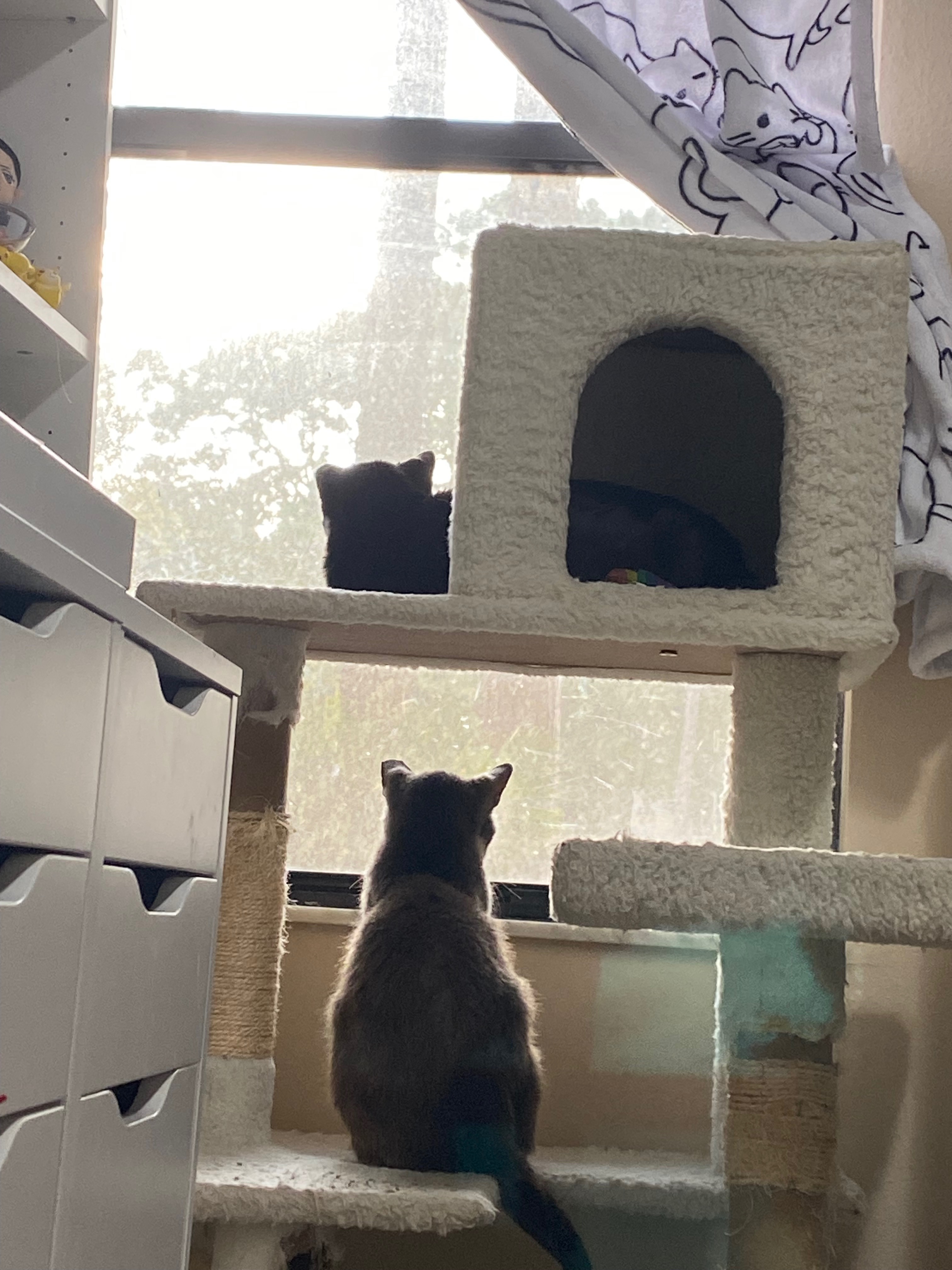After a pricey vet visit, we made it home. To my surprise, these two settled right in. Instant princesses! They use a litter box with no problem at all, cuddle on each other, play with toys… I thought they’d be climbing at the window to get out, but I suppose that compared to where they’d been living, this is a five star resort.