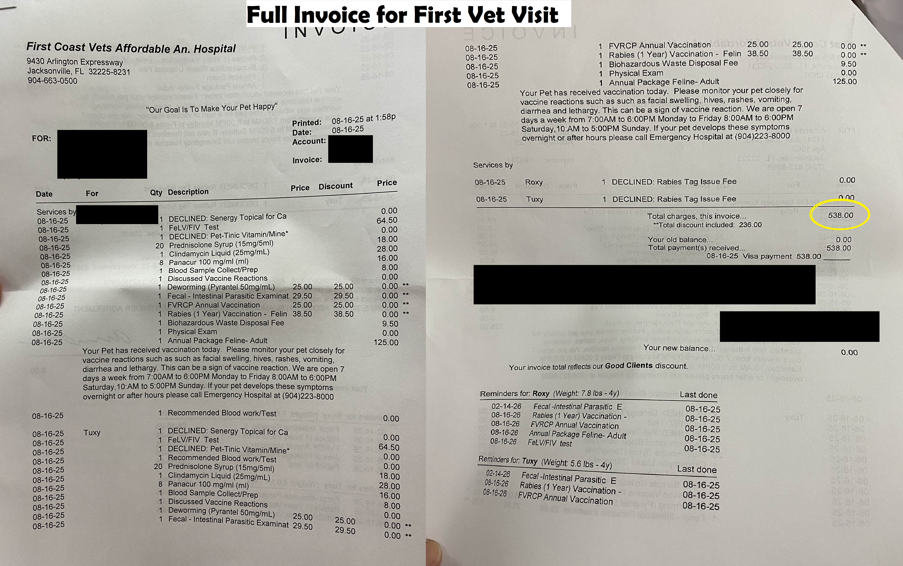 Because I’m not working with a rescue, that means that all expenses and vet bills fall directly onto me, and I already have two cats of my own. Their first appointment alone came to $538, and before I work towards getting these girls adopted, I want to get them each a full work-up and senior blood panel. This will cost another $450 at minimum, possibly more, if more treatment needed.