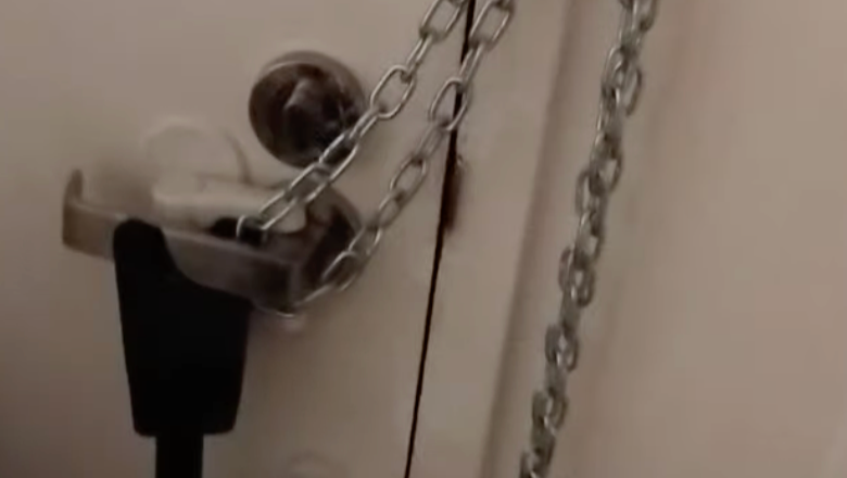 *A door jammer and chain are just a few of the measures she took to secure her front entry door. Out of view, there is an additional door jammer and tension device between the door and the closest wall. She has since further upgraded her door barricade system; she remains barricaded in her apartment to this day.