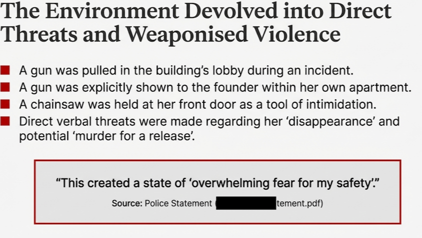The Betrayal: While Jess was barricaded inside, the competitors ex-girlfriend/ current employee/ close friend launched a digital smear campaign and then hijacked her business safety pause announcement to spread panic and create distrust in the brand. What should've been a simple safety pause while jess resolved the building matter became a permanent end to her business when the competitor blackmailed her; do the deal or I post online, on social media, on the local sub and various other channels; do the deal or suffer the consequences. She refused, he made good on his threat. He publicly shared what was happening at Jess's home and ridiculed her. The weapons. The surveillance. The OMCG enforcers in her building. He made the situation public knowledge and framed it all as a delusion. He labelled Jess mentally unwell.