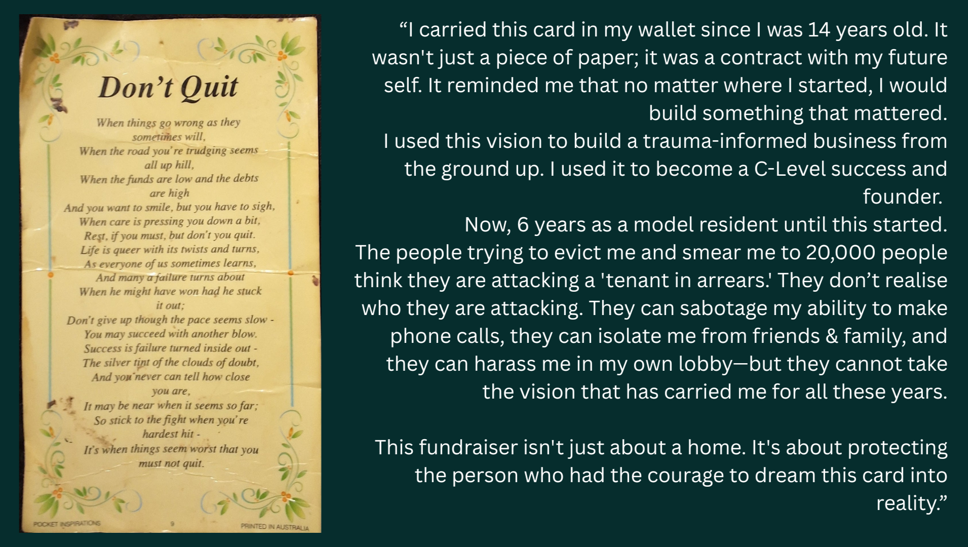 Jess hasn't left her home in months. Help set her free from the home turned into a prison and help her get justice not just for her, but for every founder, renter, and survivor who has been told they are 'too small' to fight back against organised greed. When we protect Jess, we protect the principle that a person’s home and vision are not for sale to the highest bully.