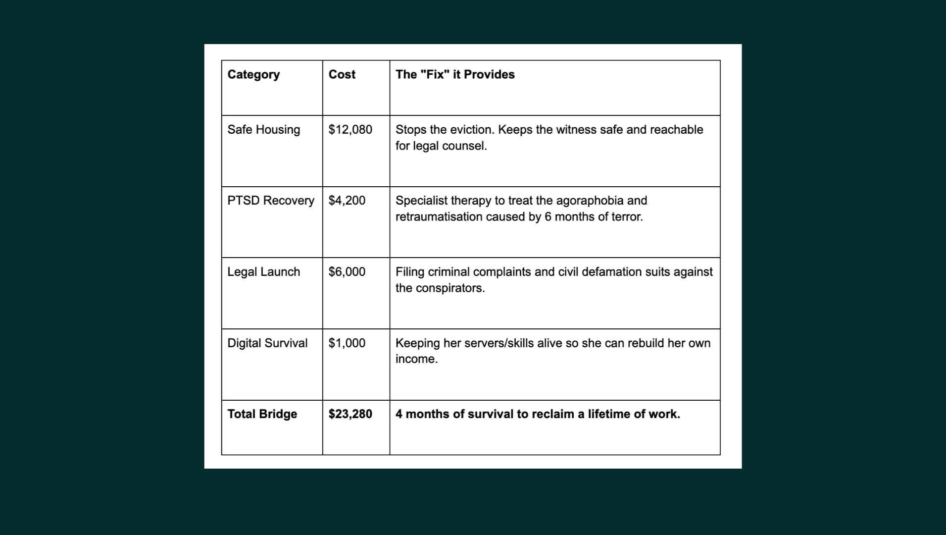 This is where the cycle stops. We aren't just asking for rent; we are funding a legal and psychological counter-offensive. We need to bridge the gap between now and April 2026.