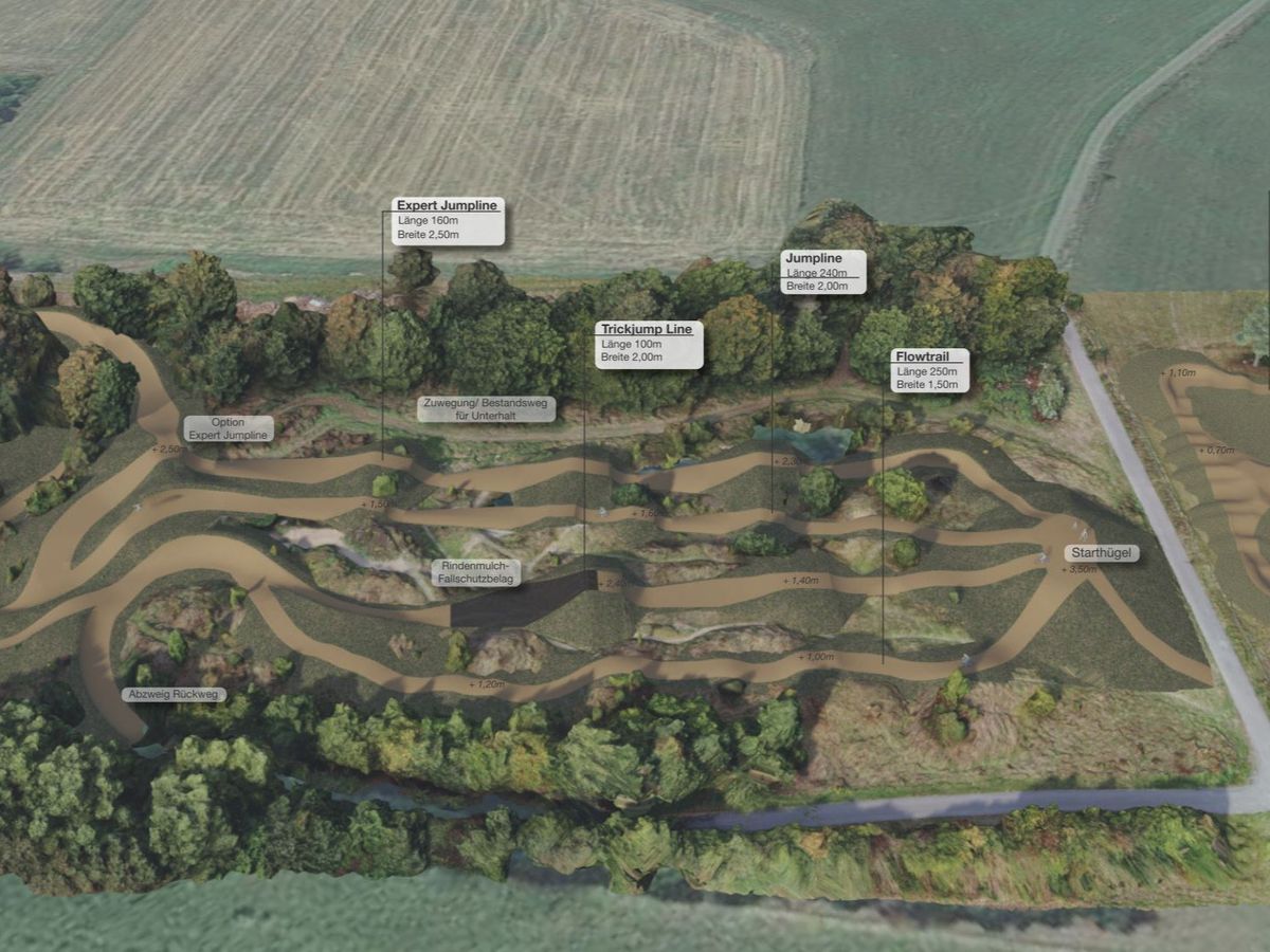Für die Planung und Umsetzung haben wir hierzu mit Joscha Forstreuther von tracksandtrails.net einen echten Profi gewinnen können. Die Pläne sind bereits erstellt und sehen sehr vielversprechend aus. Bei den Lines wurde an alle Schwierigkeitsgrade von Beginner bis Expert gedacht. Auf dem Pumptrack oder dem Flowtrail beispielsweise können bereits die 5-6 jährigen ihre ersten Biketricks ausprobieren und lernen. Auf der Expert Jumpline hingegen sind echte (Fast-) Profis gefragt.