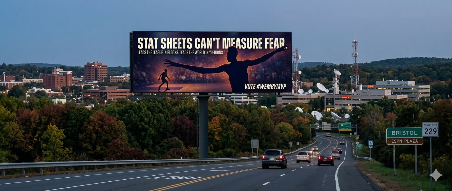 It is March 2026. Victor Wembanyama is doing things that shouldn’t be mathematically possible. He is leading the league in blocks, anchoring a top-tier defense, and quite literally changing the geometry of the court. When players see him, they turn around. That is the definition of Value. But the MVP award is decided by the media—many of whom work right there in Bristol. We want the producers of First Take, NBA Today, and SportsCenter to see Victor's impact every single morning as they drive into the office. We want to make it impossible for them to ignore the 'Alien' narrative.