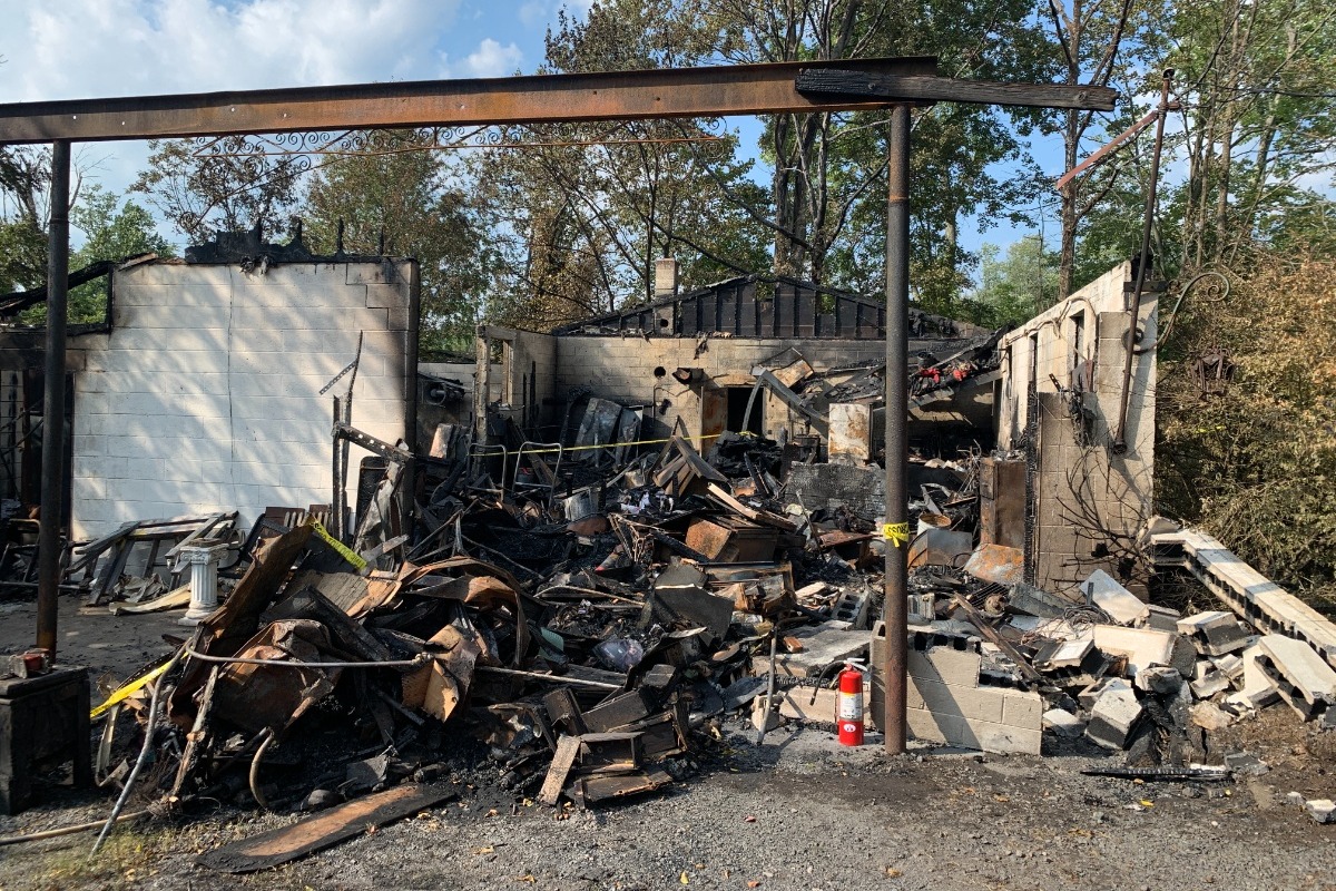 Charred van and back wall of Bill Heller’s refinishing business in Ambler, Pennsylvania