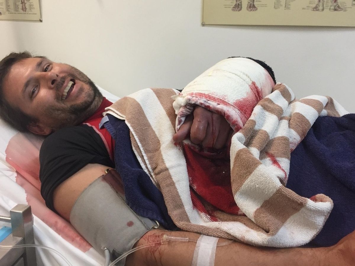 A quick hit. A big hit. Really hard, maybe like being hit by a car. But underwater. A moment of confusion and disbelief. A thought that, statistically, this never happens. I can tell you now: you have some odd thoughts when you get bit by a shark. I pulled back, and the shark pulled back, and then I was surrounded by blood and fatty tissue floating in the water column. I was snorkelling so I held my arm high out of the water to try and get the electrical impulses of my twitching forearm out of the water so it couldn’t be detected by more sharks. Sharks love nothing more than the pulsing electrical impulses from spasming muscles. My hand curled involuntarily into a ball and I felt the tendons pull up into my arm; all my extensor tendons were severed. I managed to swim over and climb into the boat, and not drop the video camera I was holding in my right hand.