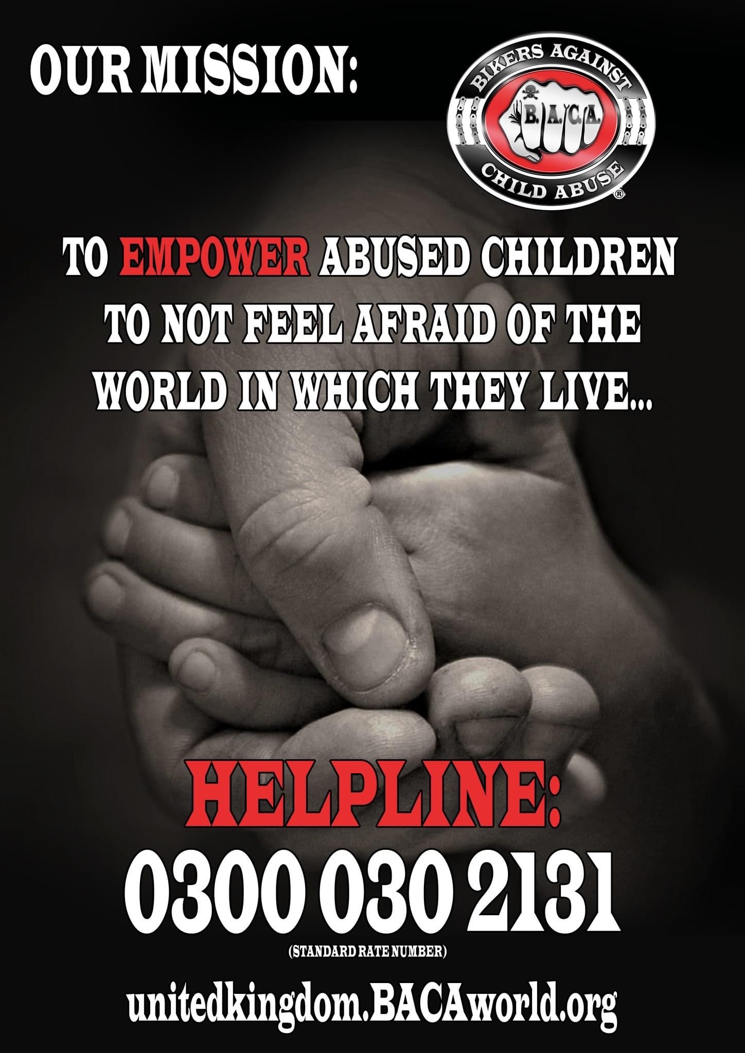 Bikers Against Child Abuse (B.A.C.A.) is a not-for-profit organisation, with a Mission to create a safer environment for abused children, and to empower them to not feel afraid of the world in which they live. B.A.C.A. works in conjunction with local and national officials already in place to protect children. No B.A.C.A. Members or Supporters take any money for their time, fuel or wear and tear on their bikes; every penny donated goes towards their Mission. B.A.C.A. remains on-call for the children they support 24/7/365.
