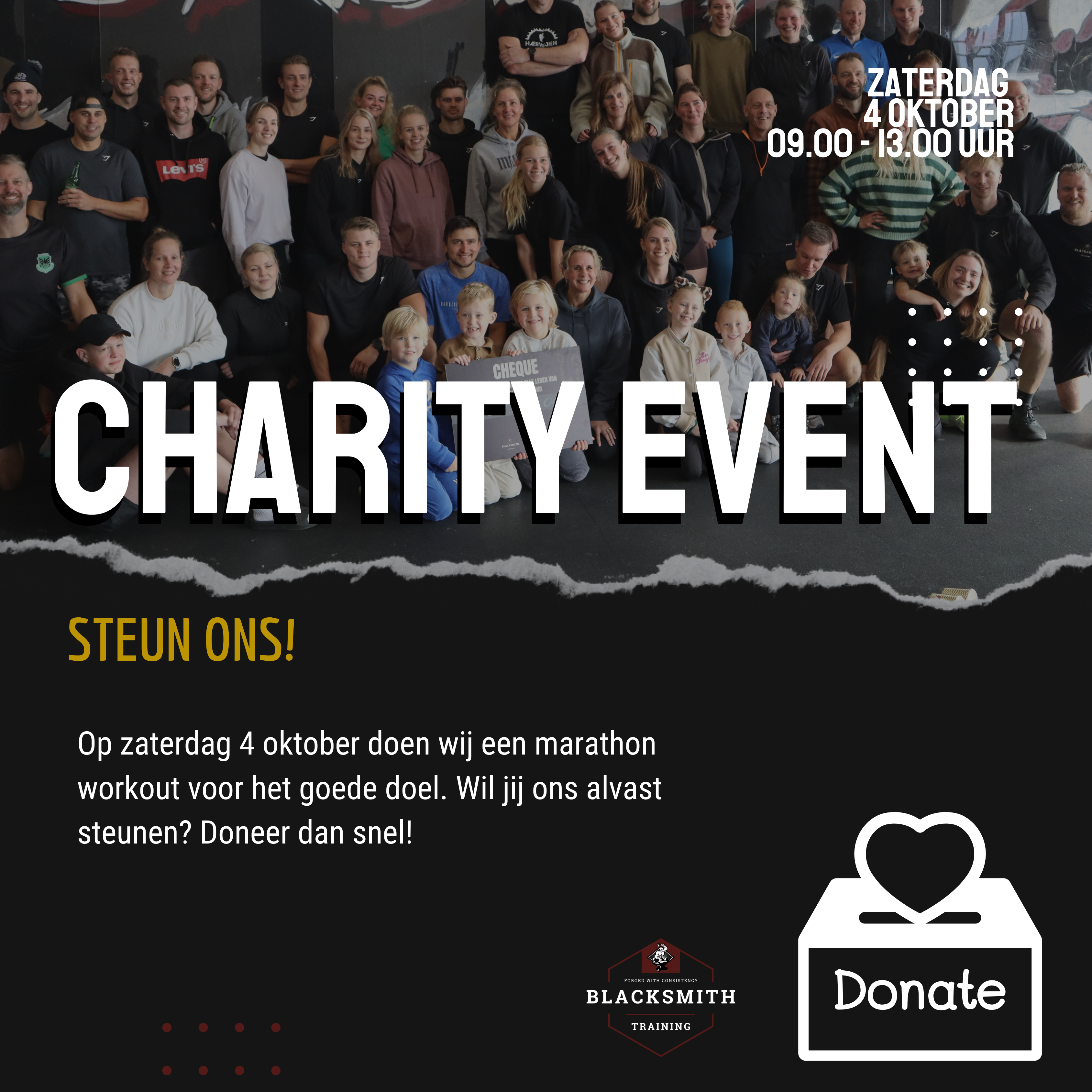 In 2024 organiseerde Blacksmith Training in Scheemda hun eerste Charity Event. Met succes. Er werd een fantastisch bedrag van 2800 euro opgehaald. Dit jaar vindt het evenement weer plaats, op zaterdag 4 oktober. In de weken voorafgaand aan het evenement wordt al geprobeerd om zoveel mogelijk geld op te halen. Daar hebben we jou bij nodig!