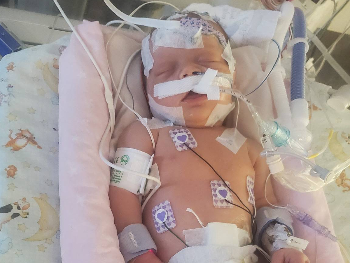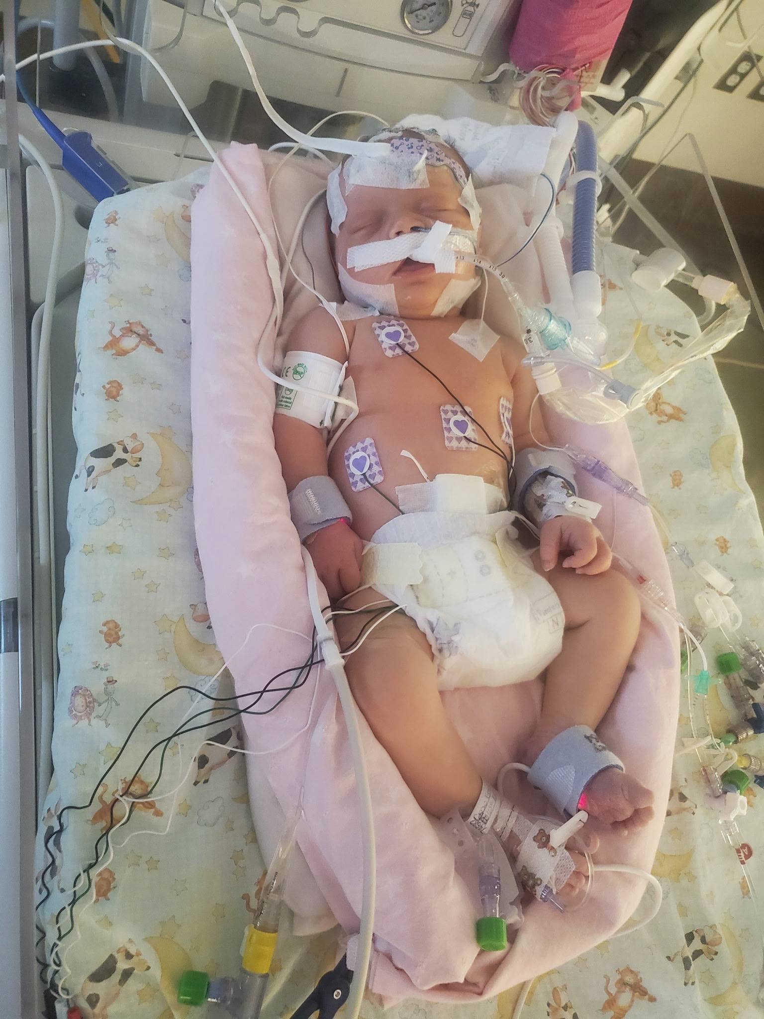 Lyric was born with a left ventricle dysfunction and VSD that kept her at the University of Iowa Stead Family Children's Hospital for the weeks to come in various units, including the PICU where she had to be sedated and ventilated and needed cardiac support. The heart issues she was having was having a chain reaction on her other organs and throughout her body.